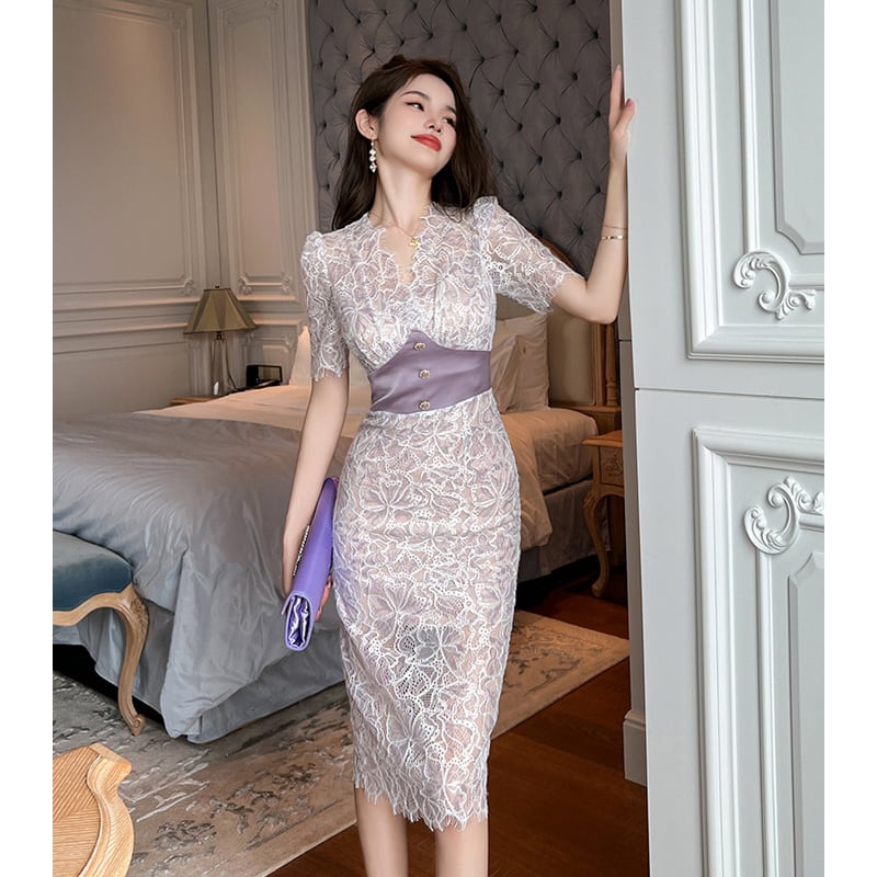 【夕暮薔薇シリーズ】ワンピース セクシー レース パーティー Vネック ライトパープル S M L XL