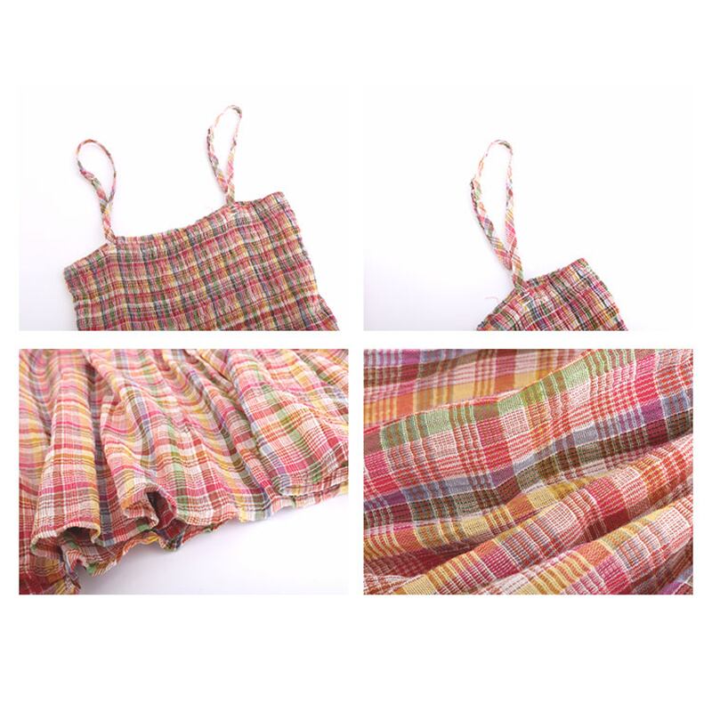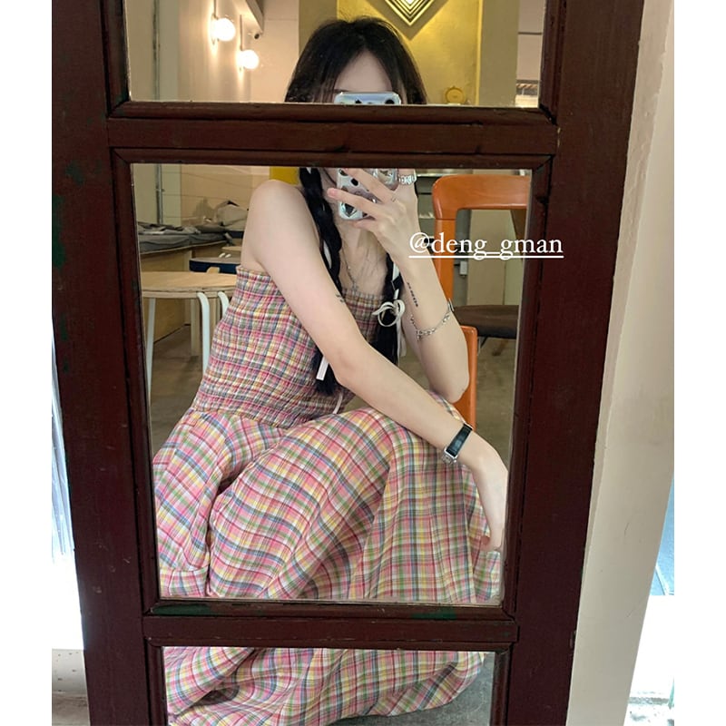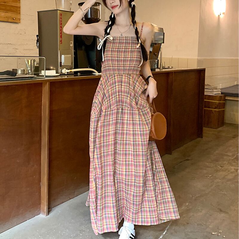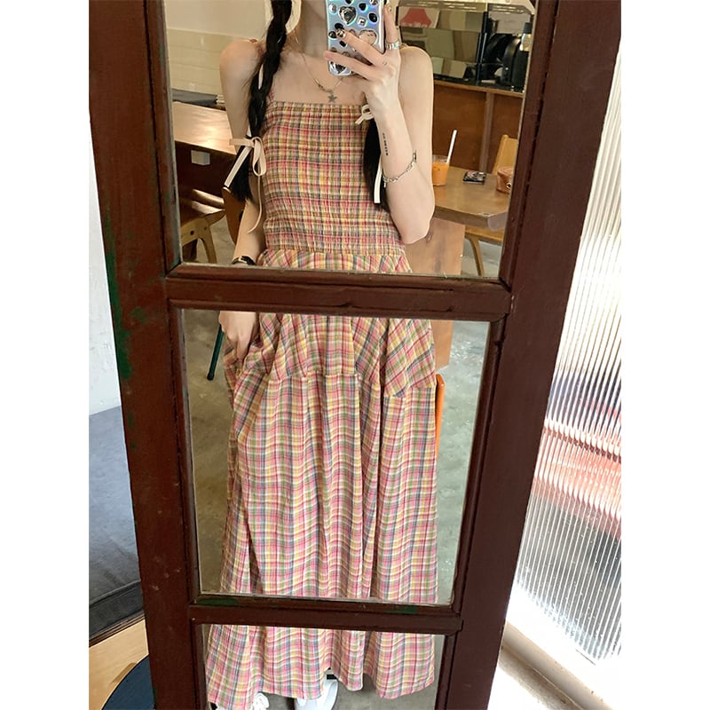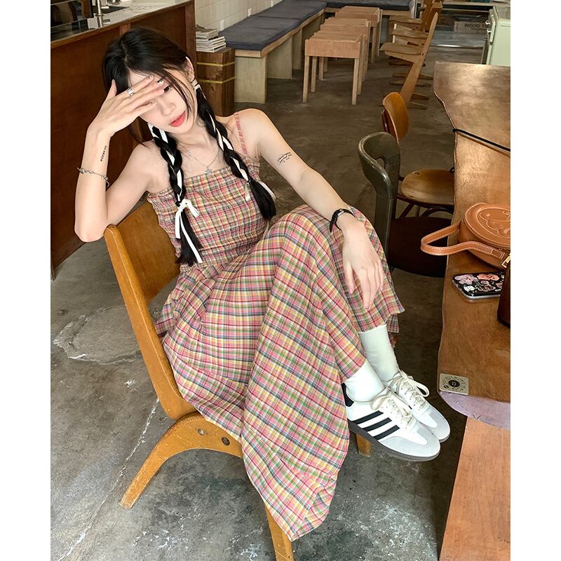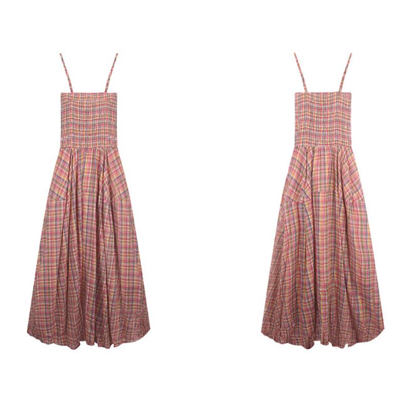 ワンピース ガーリー 文芸風 清新 チェック柄 ロング丈 吊りワンピース S M