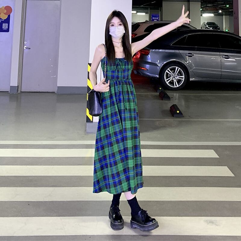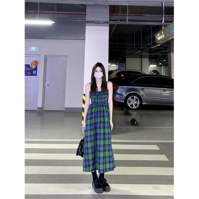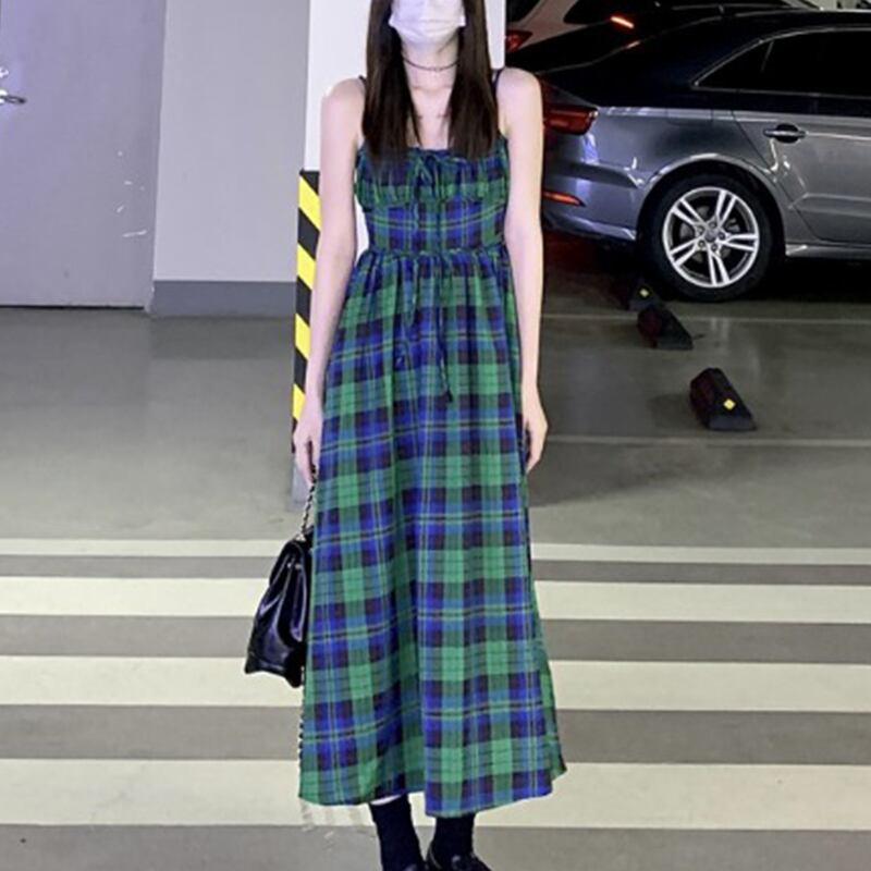 ワンピース OL/通勤 Aライン ロング丈 チェック柄 グリーン 吊りワンピース S M L