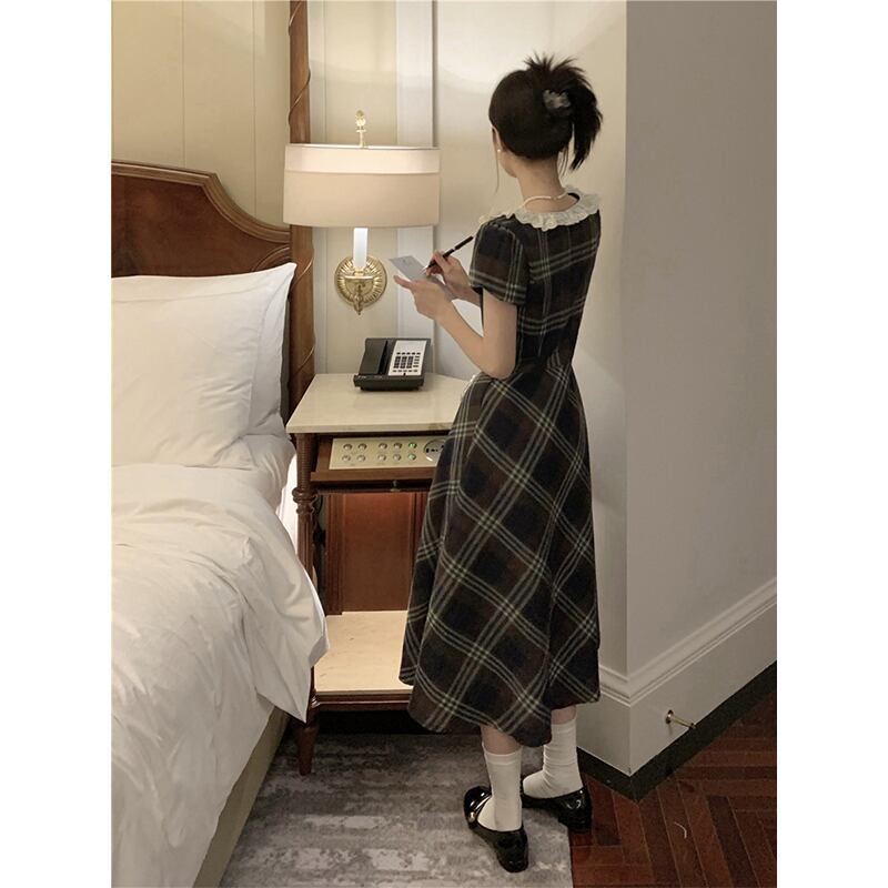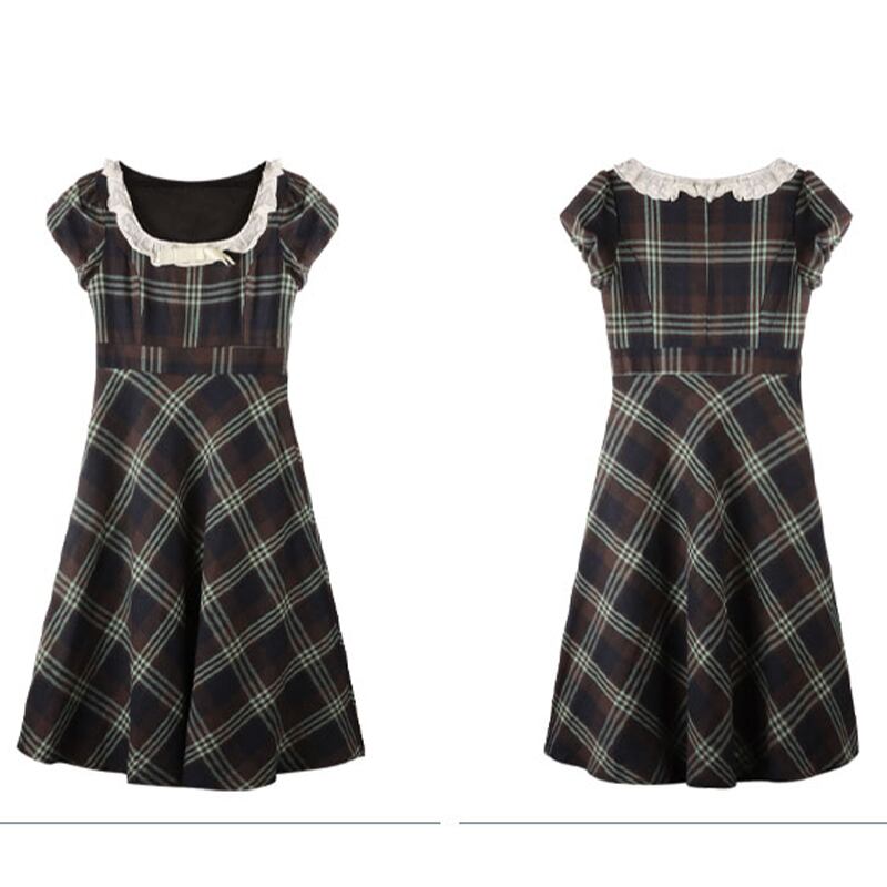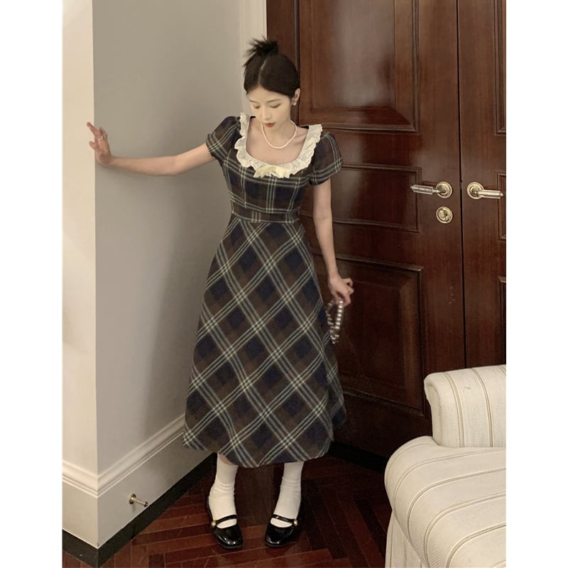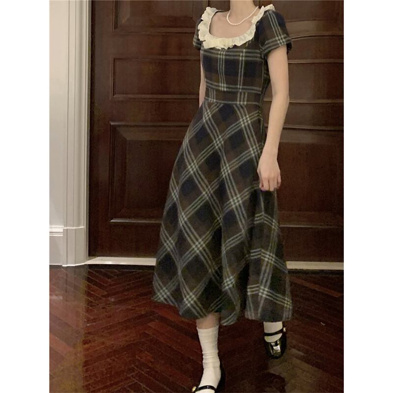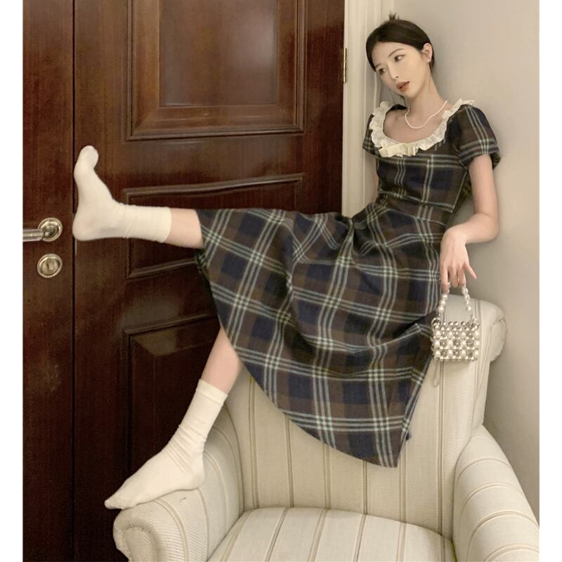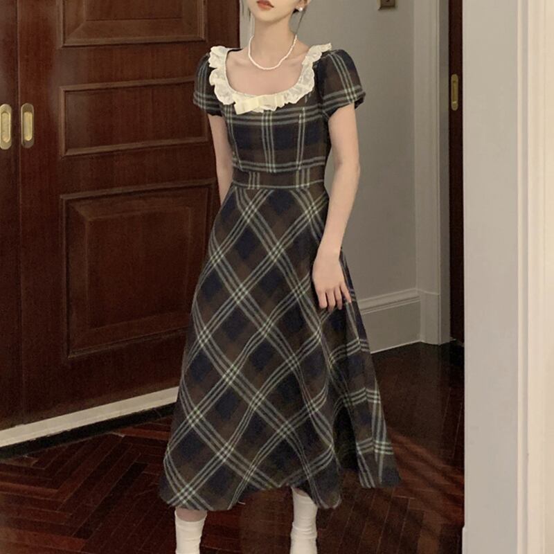 ワンピース ガーリー レトロ Aライン チェック柄 スクエアネック レース S M L XL