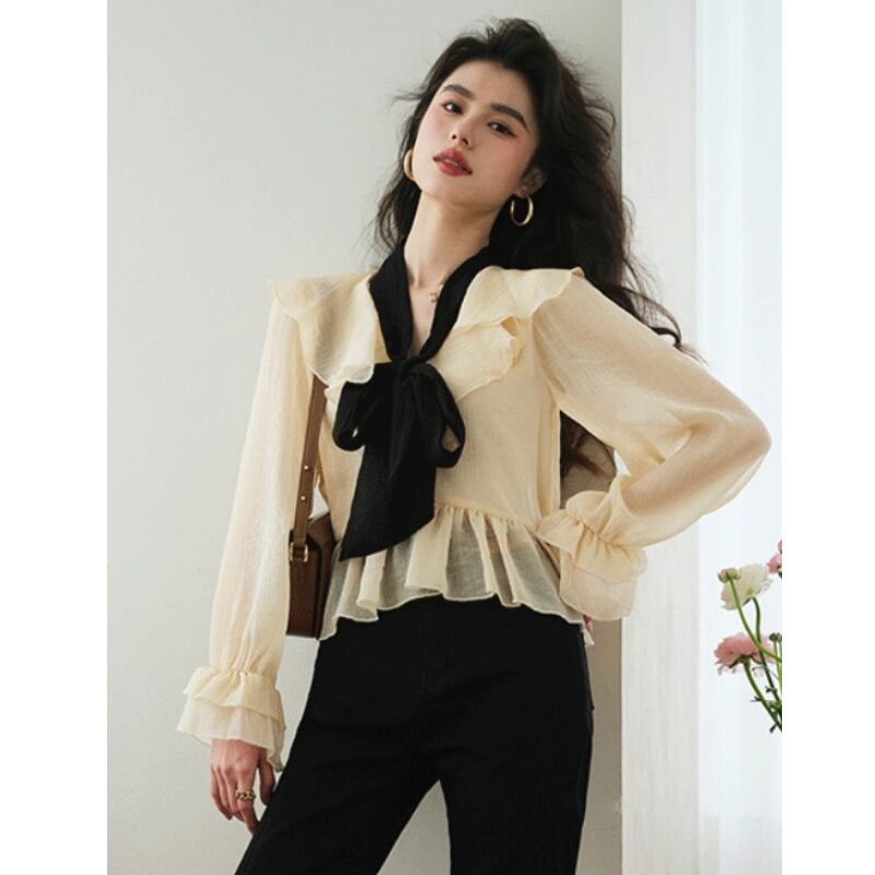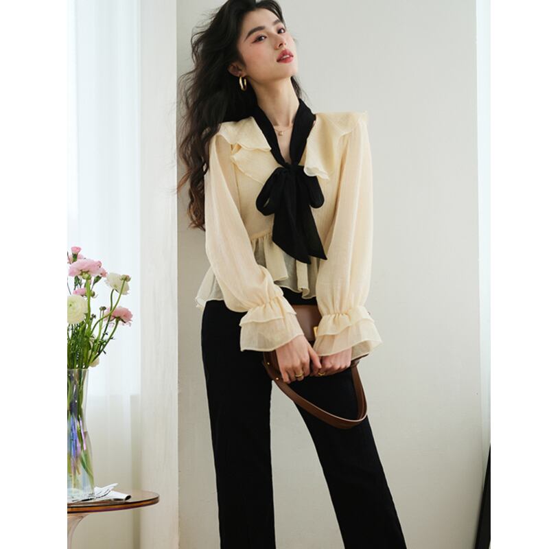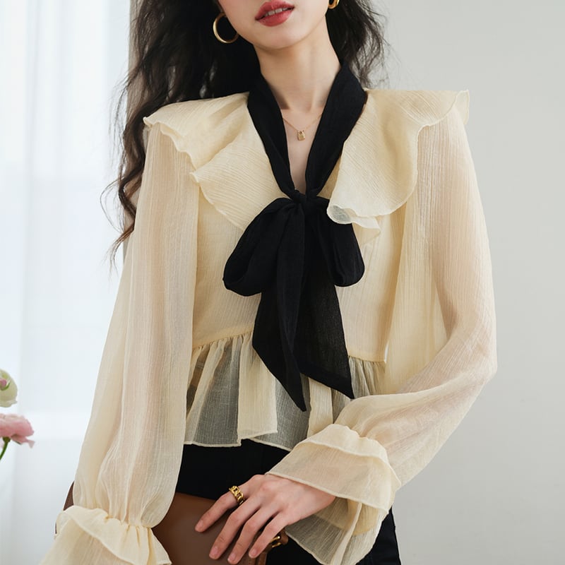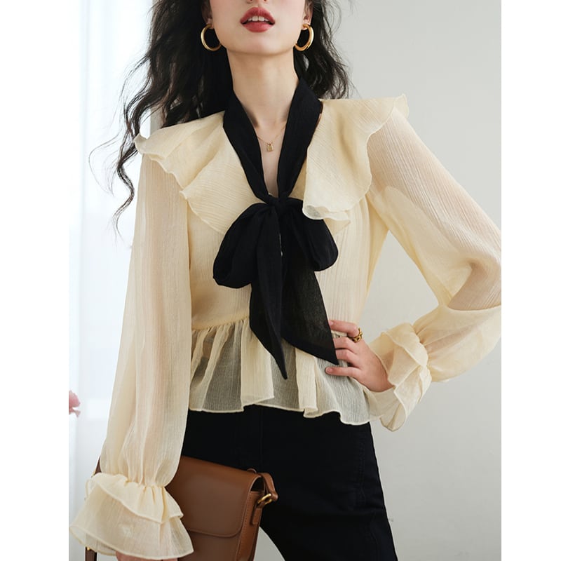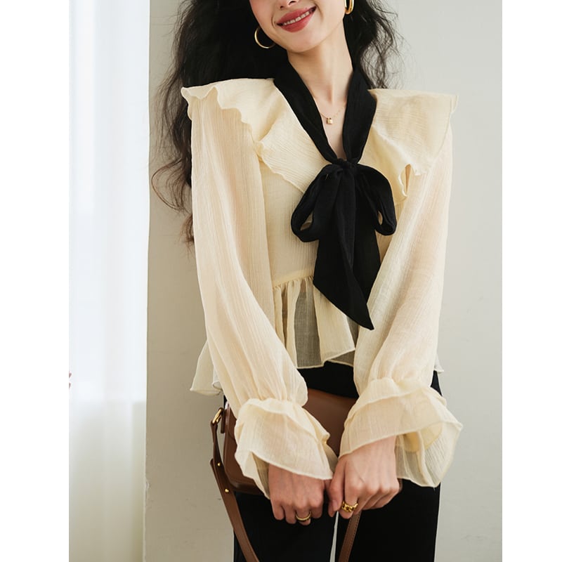 【依妃漫シリーズ】トップス シャツ · ブラウス リボン ペプラム 長袖 エレガント イエロー S M