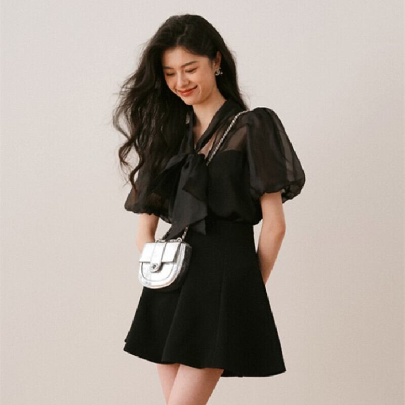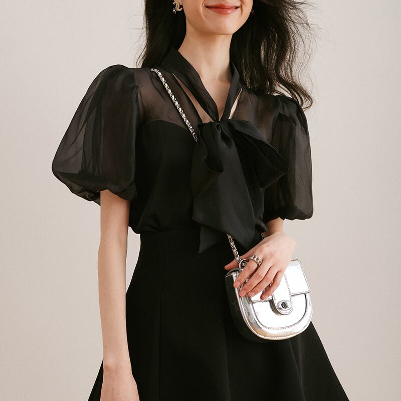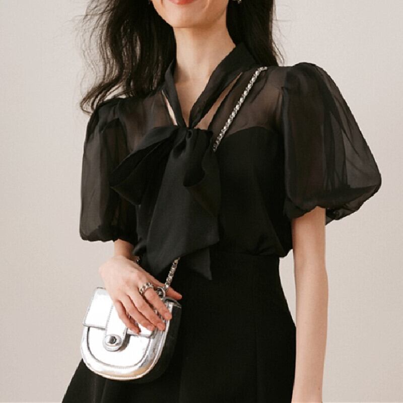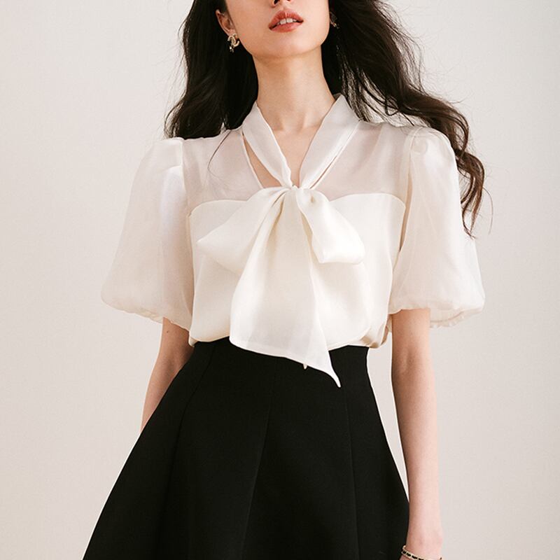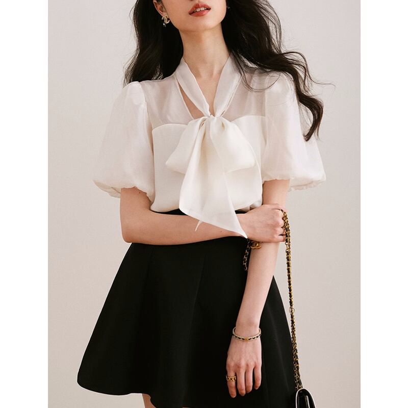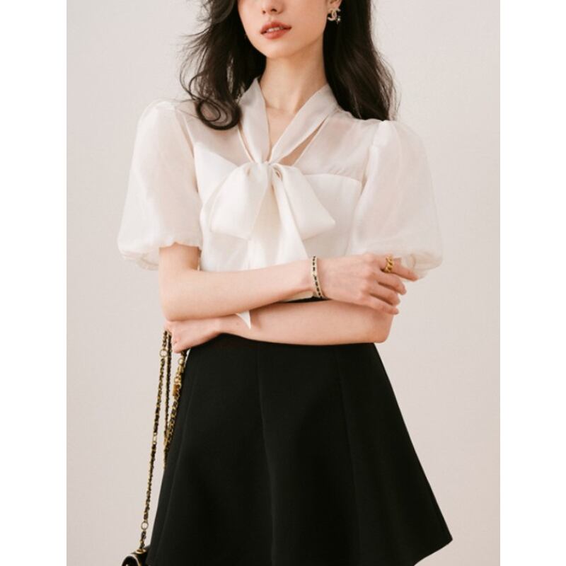 【依妃漫シリーズ】トップス シャツ · ブラウス 2色展開 無地 リボン ペプラム パフスリーブ ホワイト ブラック S M