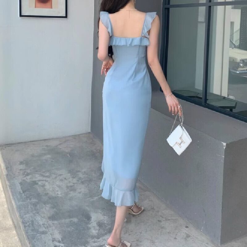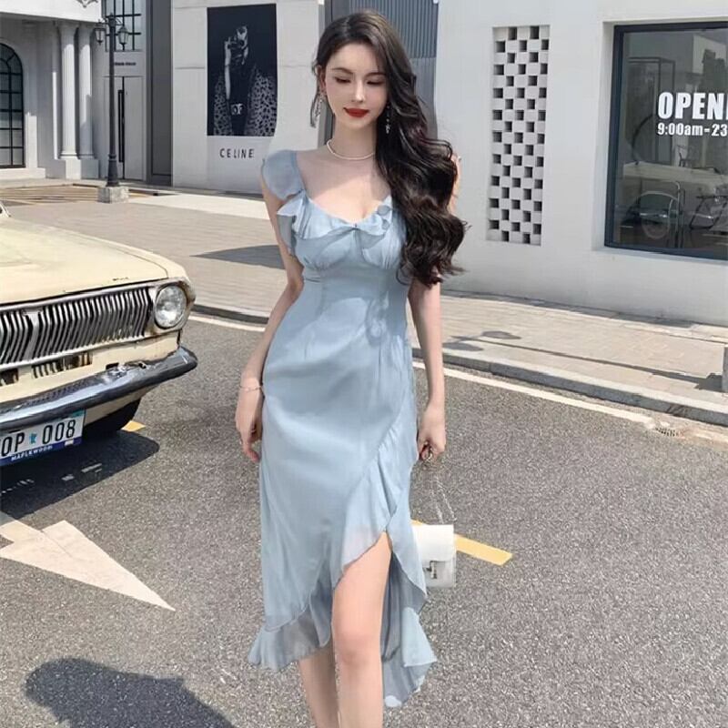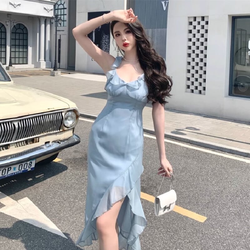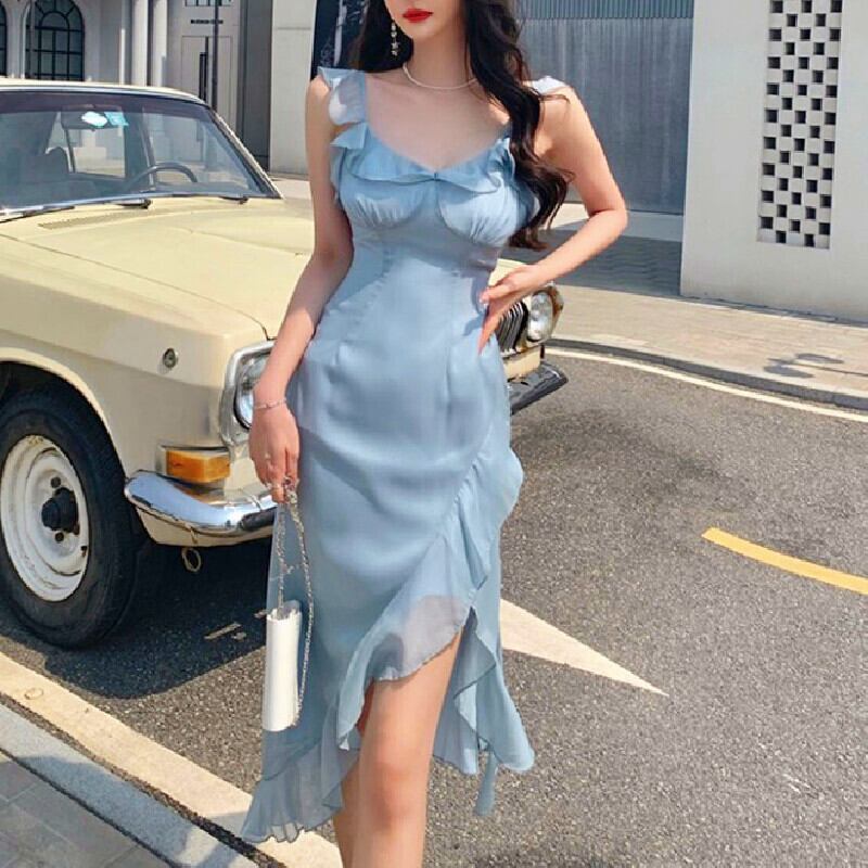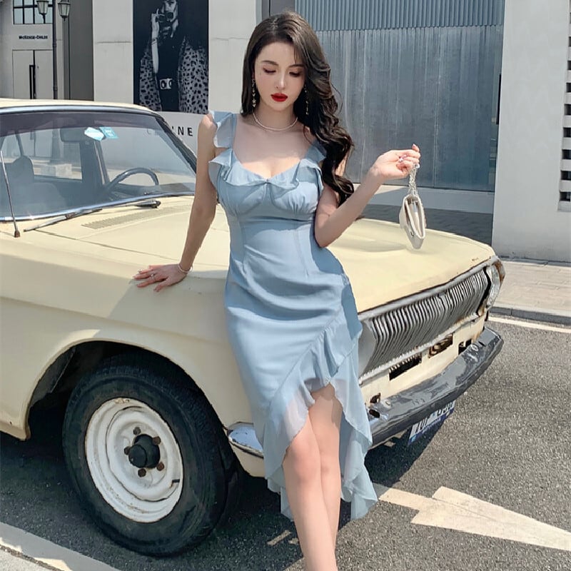 ワンピース 不規則 水色 スリット 吊りワンピース ペプラム ブルー S M L XL