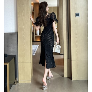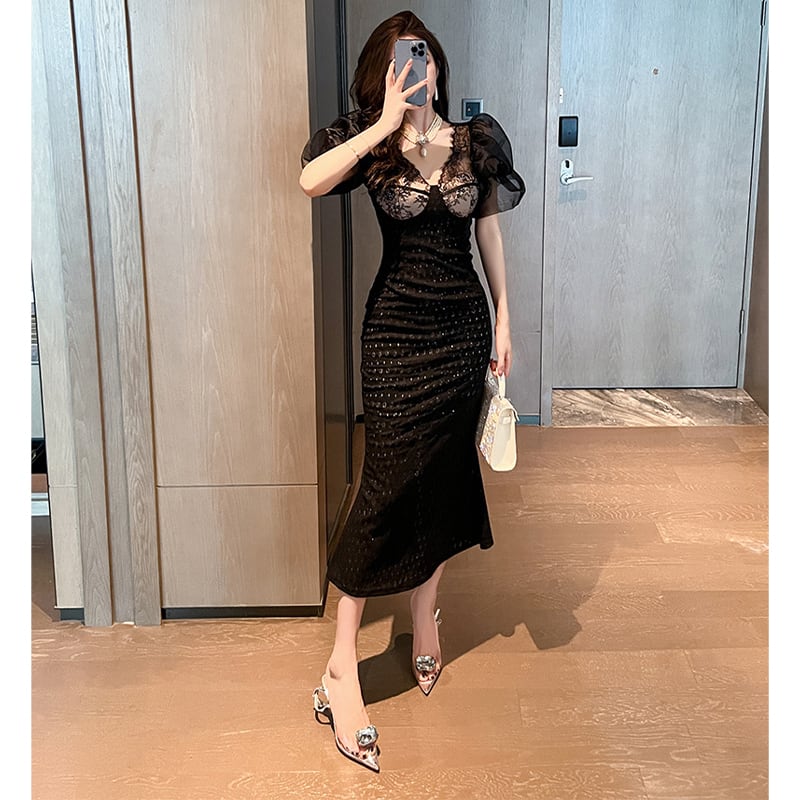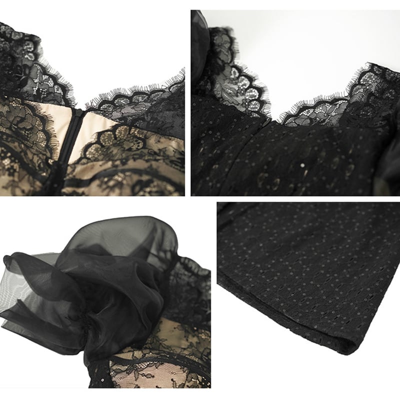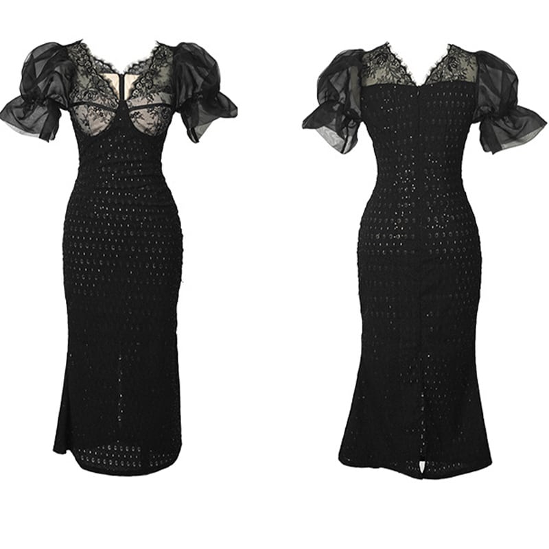 【夕暮薔薇シリーズ】ワンピース セクシー Vネック レース 魅せられる ブラック S M L XL