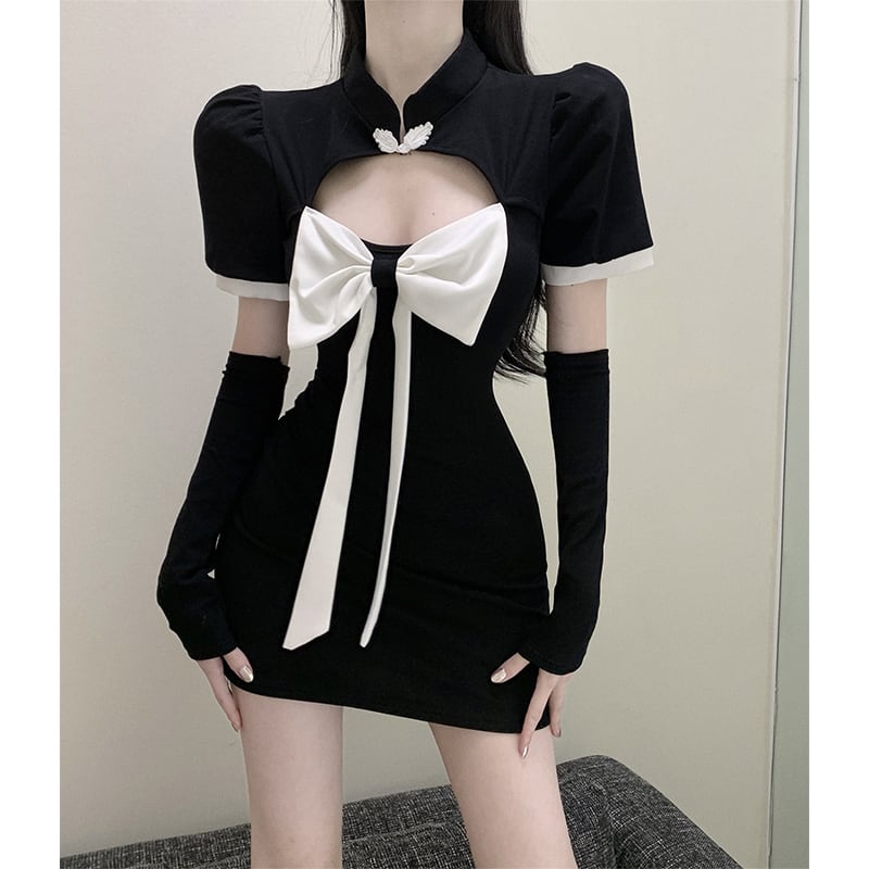 ワンピース 袖付き セクシー 蝶結び 韓国系 個性 ブラック S M L XL