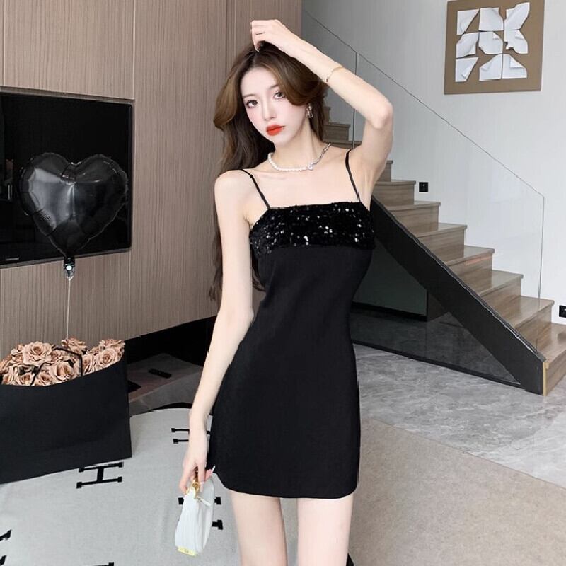 【CHERRYシリーズ】ワンピース スパンコール 黒 吊りワンピース ブラック S M L