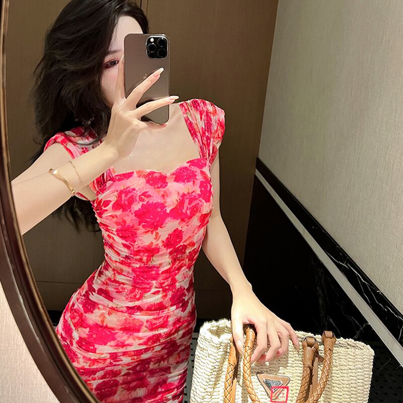 【夕暮薔薇シリーズ】ワンピース エレガント シュート丈 パーティー ローズ 花柄 ばら色 S M L XL
