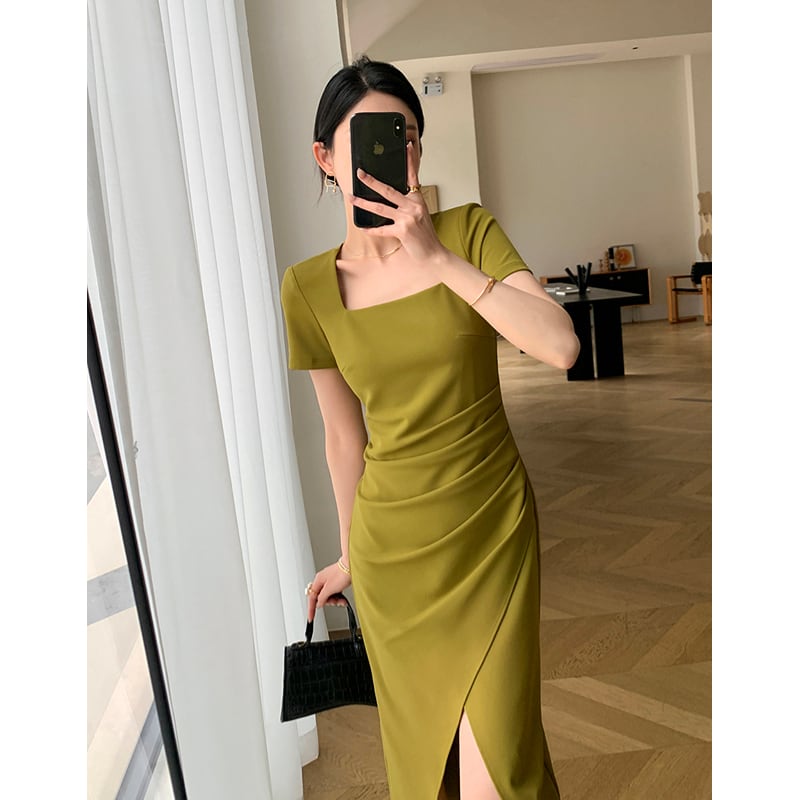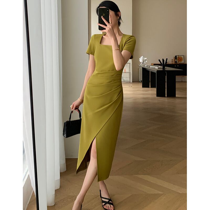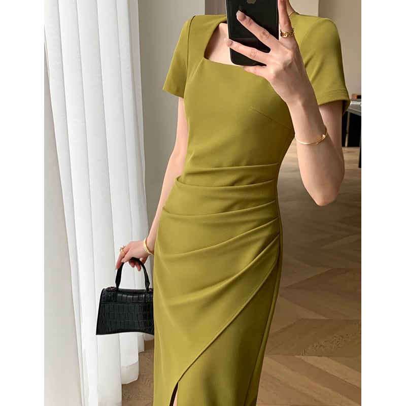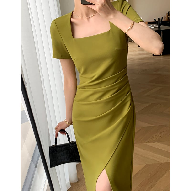 【森森家シリーズ】ワンピース スクエアネック OL/フォーマル タイトワンピース グリーン S M L XL