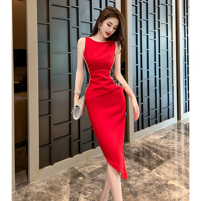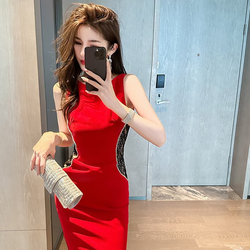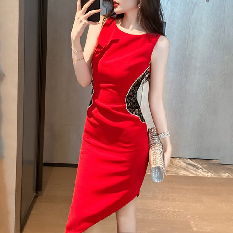【夕暮薔薇シリーズ】ワンピース セクシー ノースリーブ パーティー レース 切り替え レッド ブラック S M L