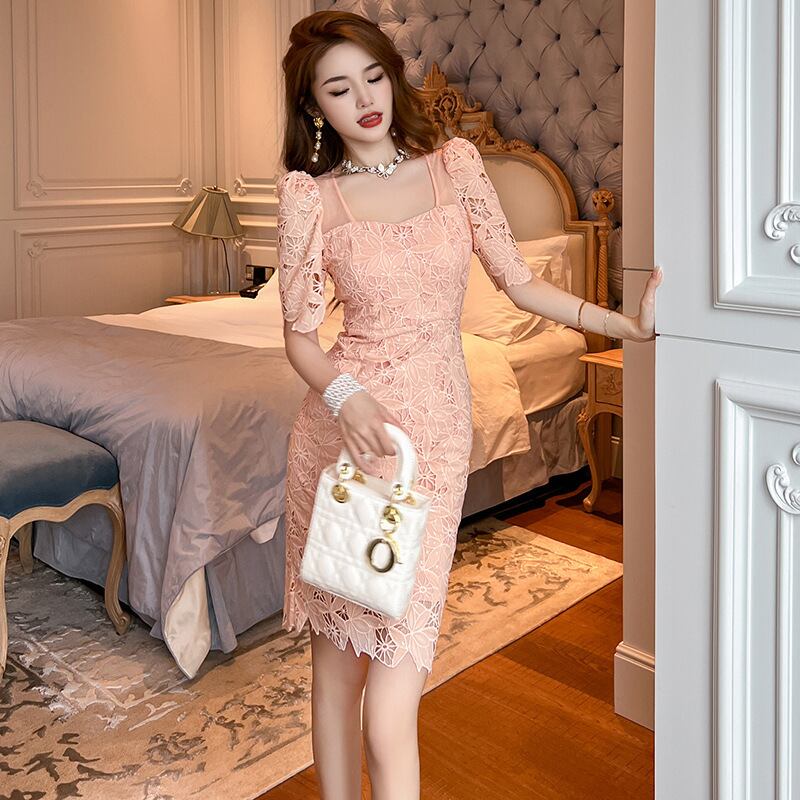 【夕暮薔薇シリーズ】ワンピース パーティー スクエアネック レース 透かし彫り S M L XL