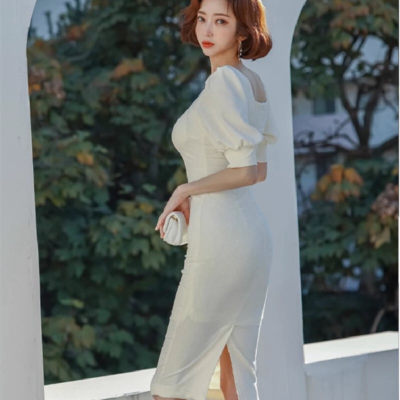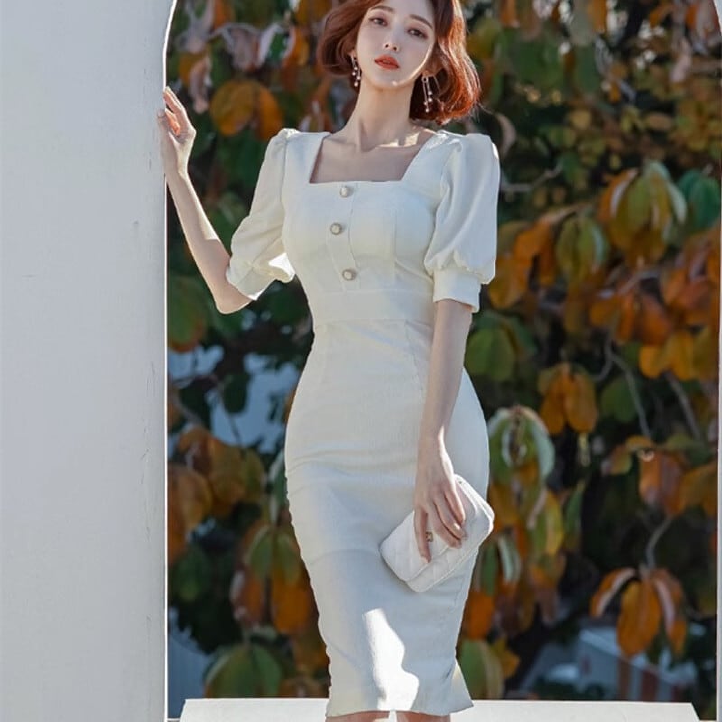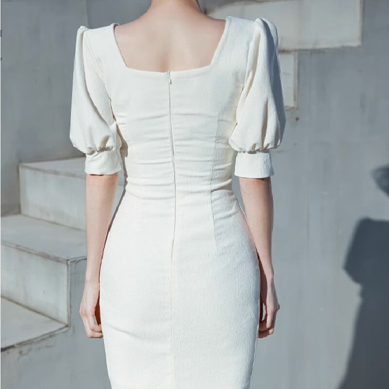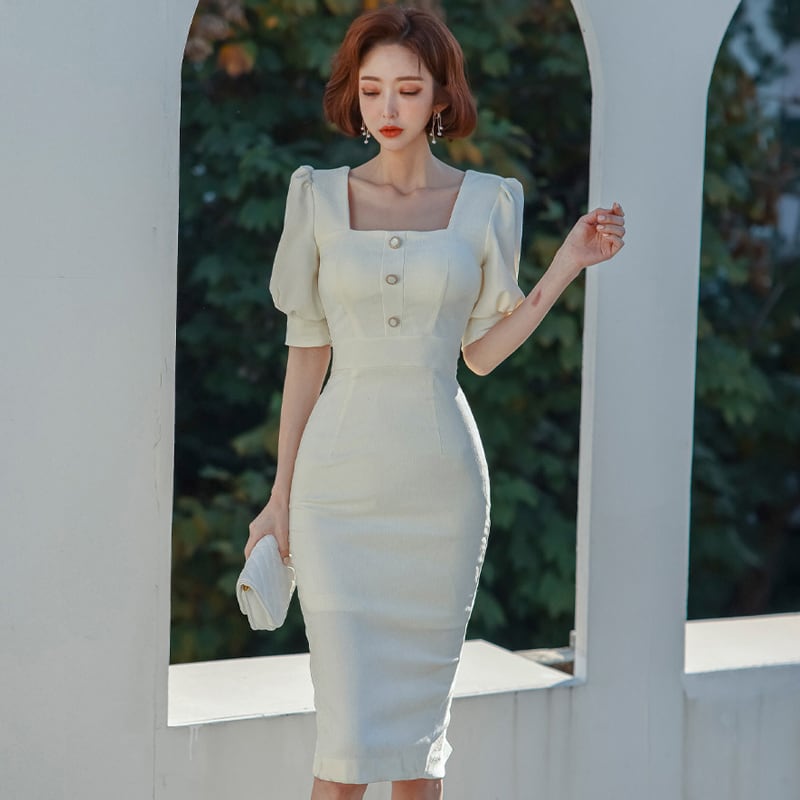 ワンピース パフスリーブ 気質アップ スクエアネック フェミニン ライトベージュ S M L XL