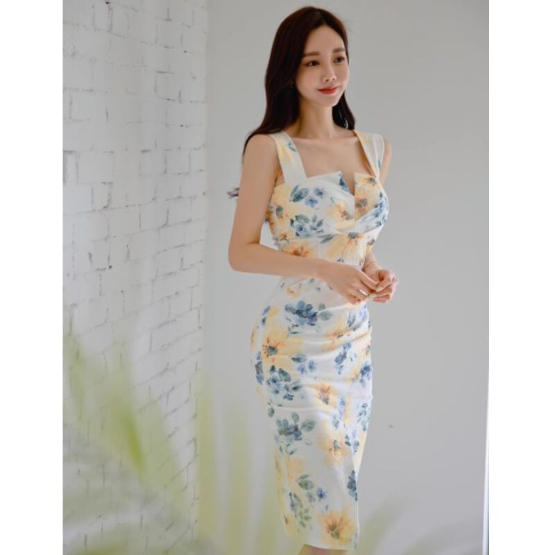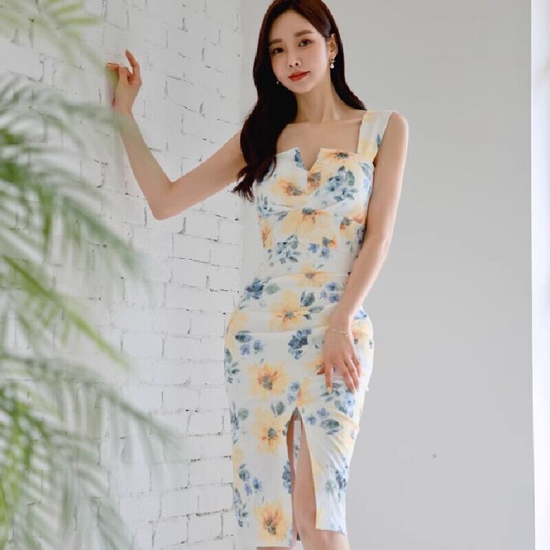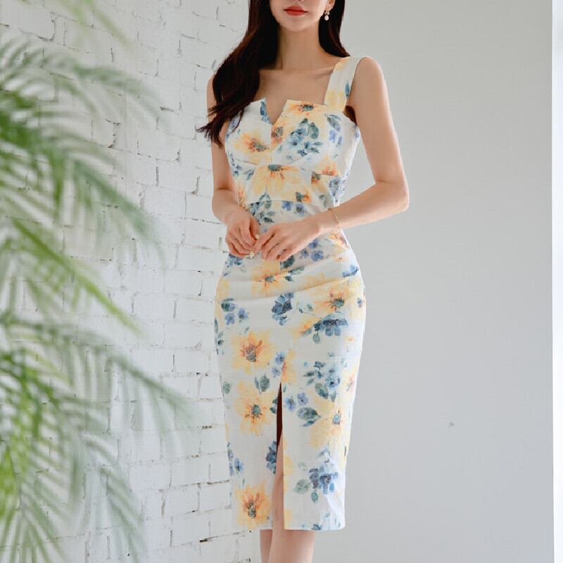 ワンピース 花柄 スクエアネック 美人度アップ 前スリット S M L XL