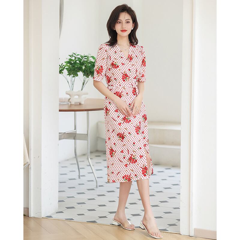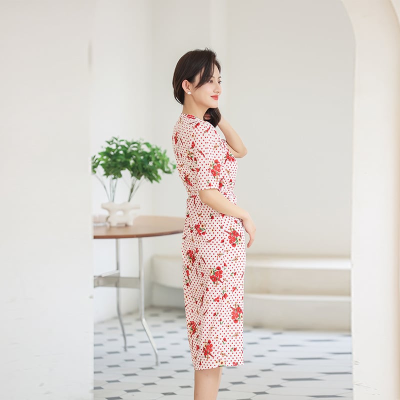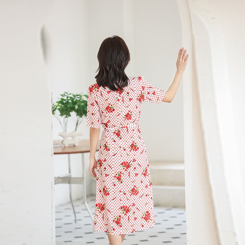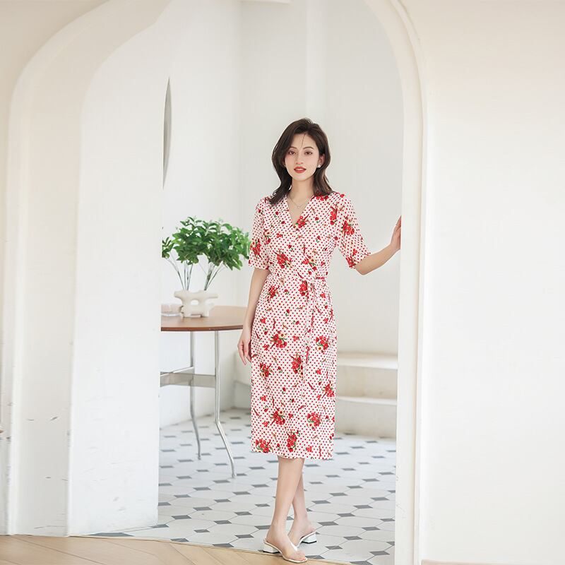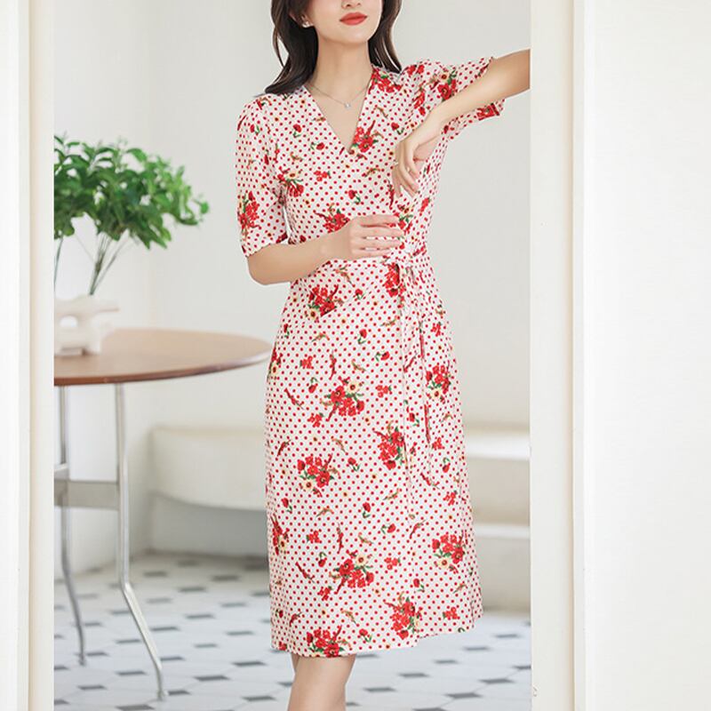 【STRAWBERRY シリーズ】ラップワンピース セクシー レトロ Vネック 花柄 S字型 巻きつける ロング丈 XS S M L XL