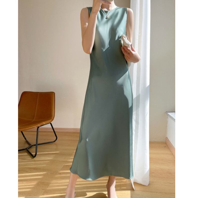 【紫陽花シリーズ】ワンピース ラウンドネック 通勤 大きいサイズ 無地 グリーン ベージュ S M L XL 2XL