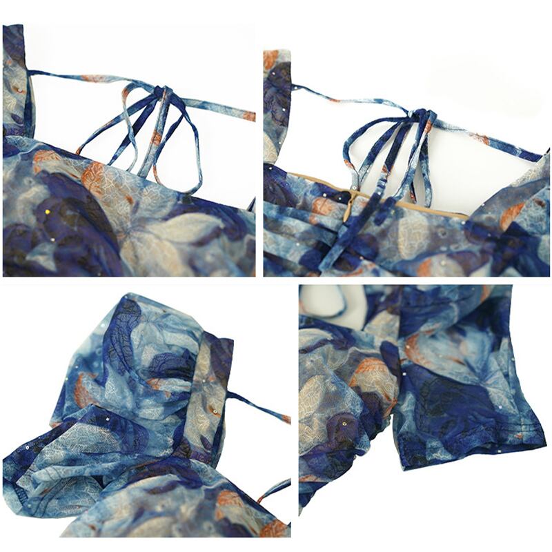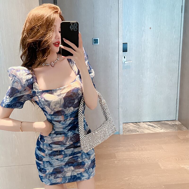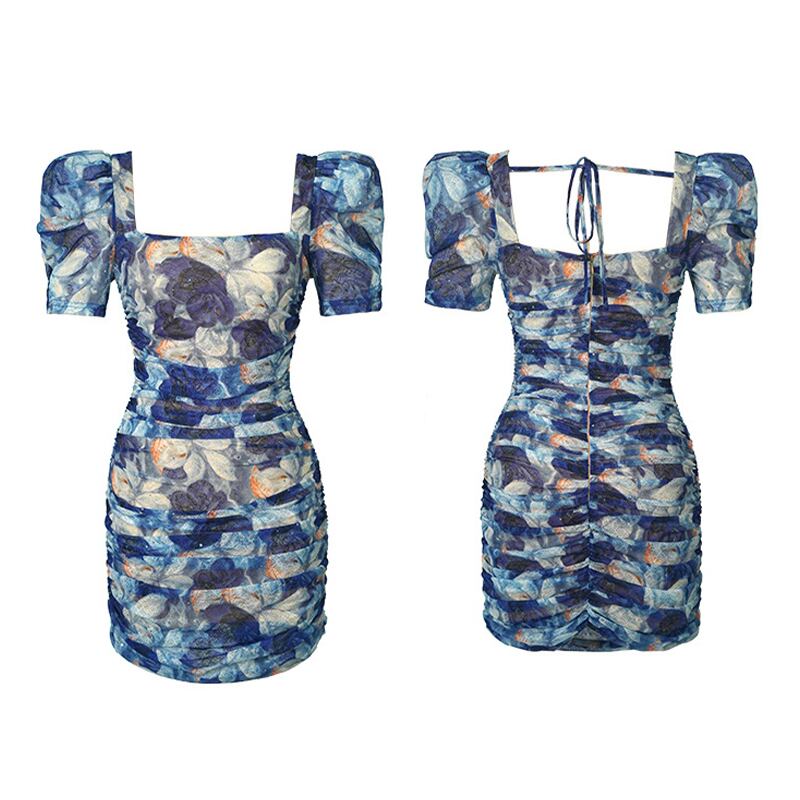 【夕暮薔薇シリーズ】ワンピース セクシー 花柄 気質UP スクエアネック ブルー S M L XL