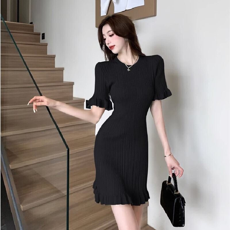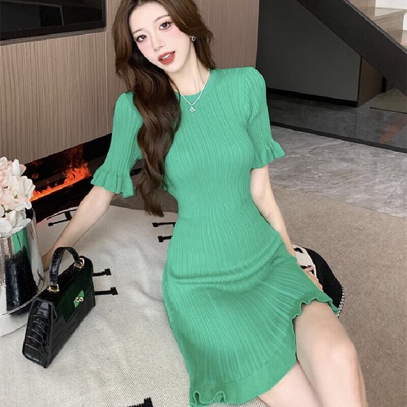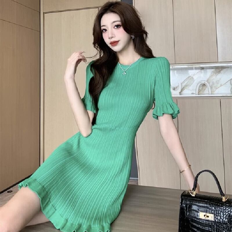 【CHERRYシリーズ】ワンピース 2色展開 ニット 緑 Aライン 無地 グリーン ブラック S M L