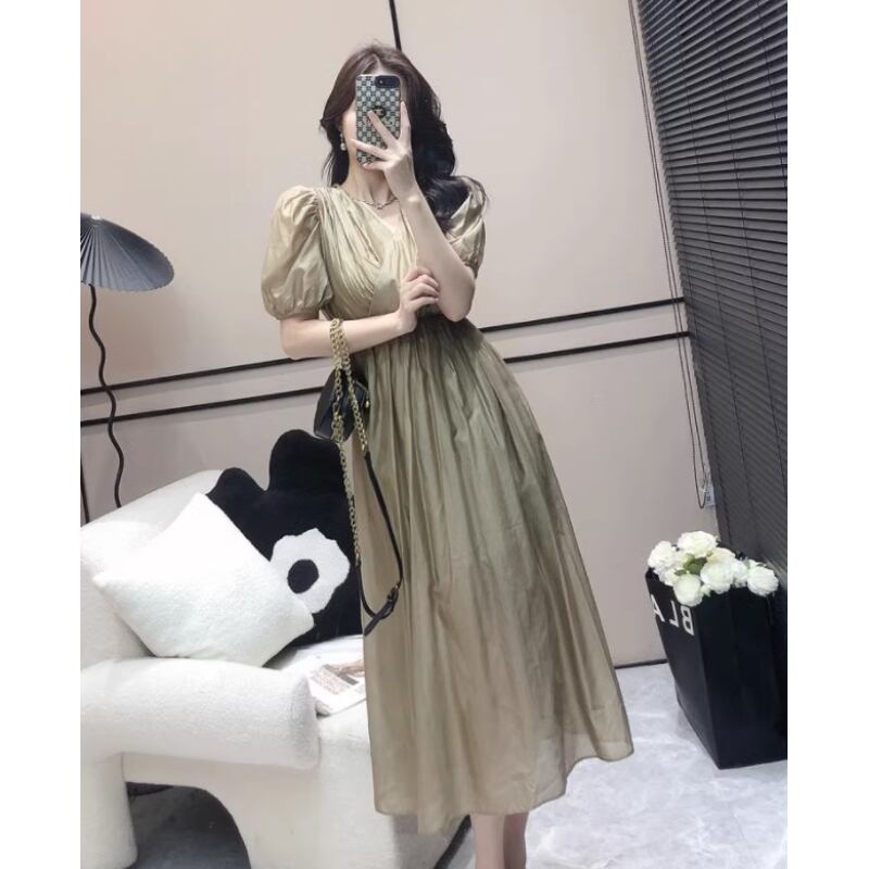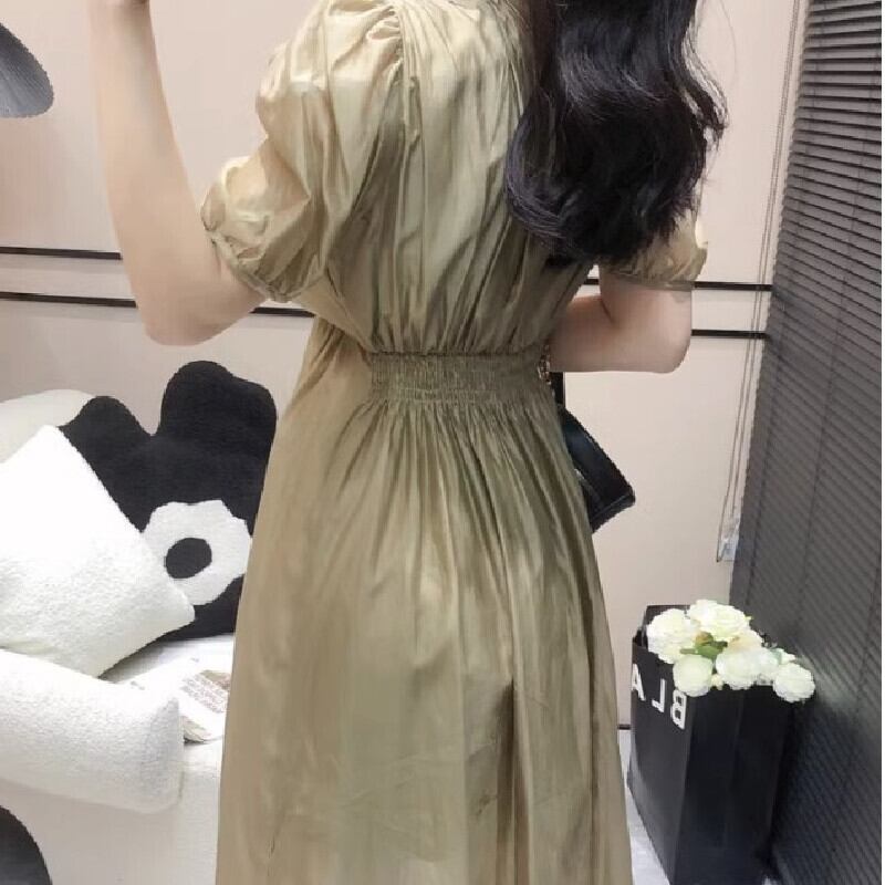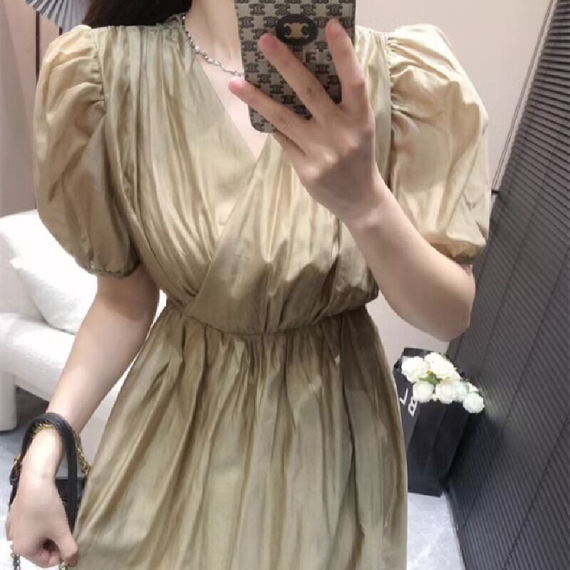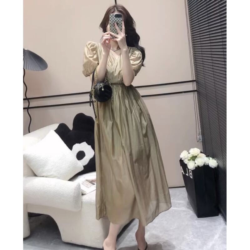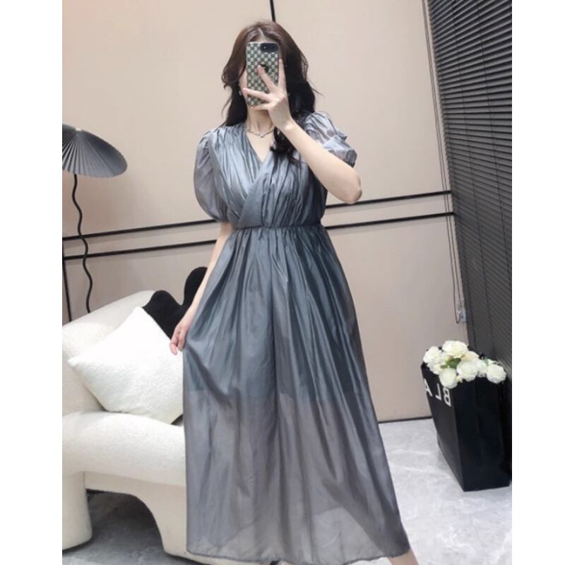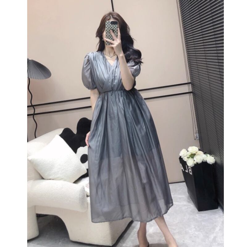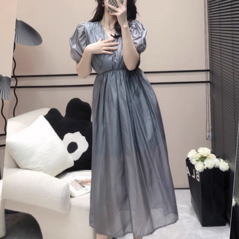 ロングワンピース パフスリーブ Vネック 無地 グレー ライトブラウン