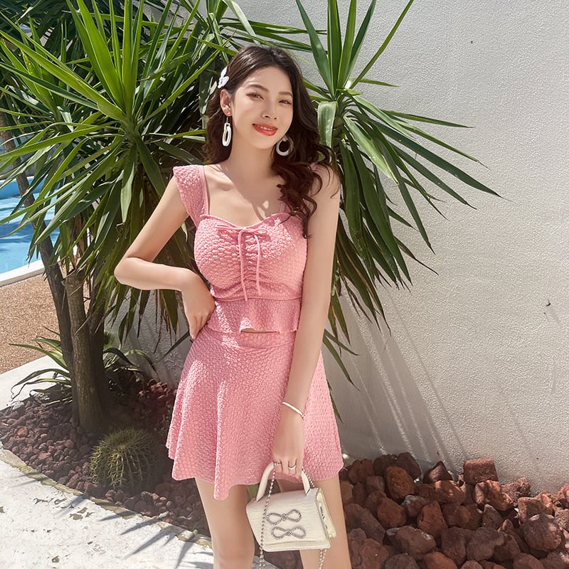 水着 3色展開 ペプラム スクエアネック 無地 ピンク グリーン ブラック M L XL