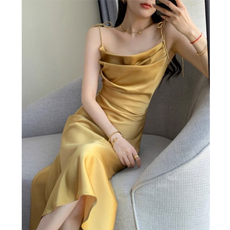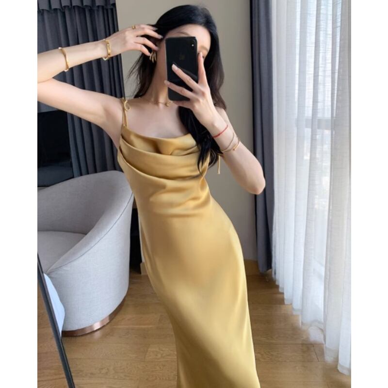 ロングワンピース 無地 黄色い フィッシュテール パーティー イエロー S M L XL
