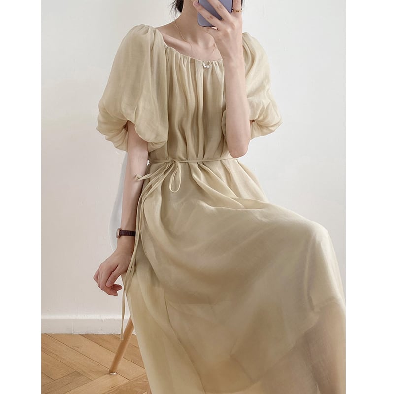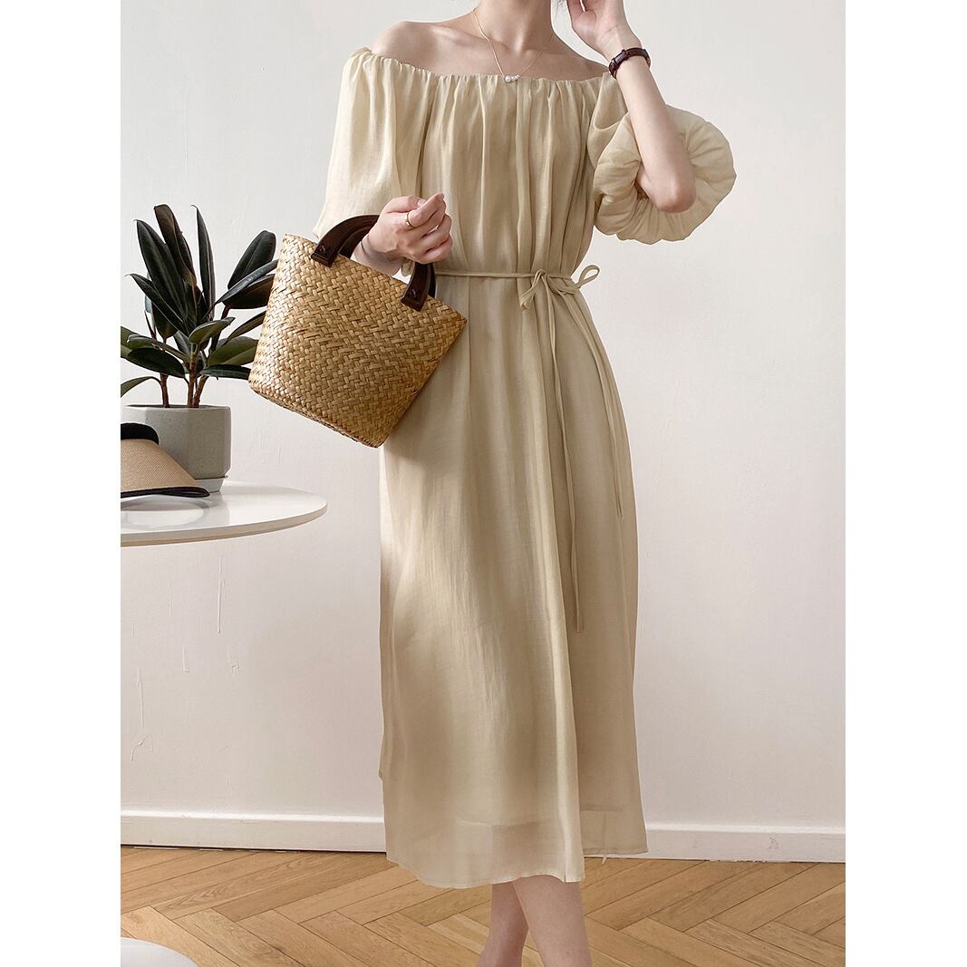 ワンピース パフスリーブ 無地 カジュアル ベージュ パープル グリーン M L