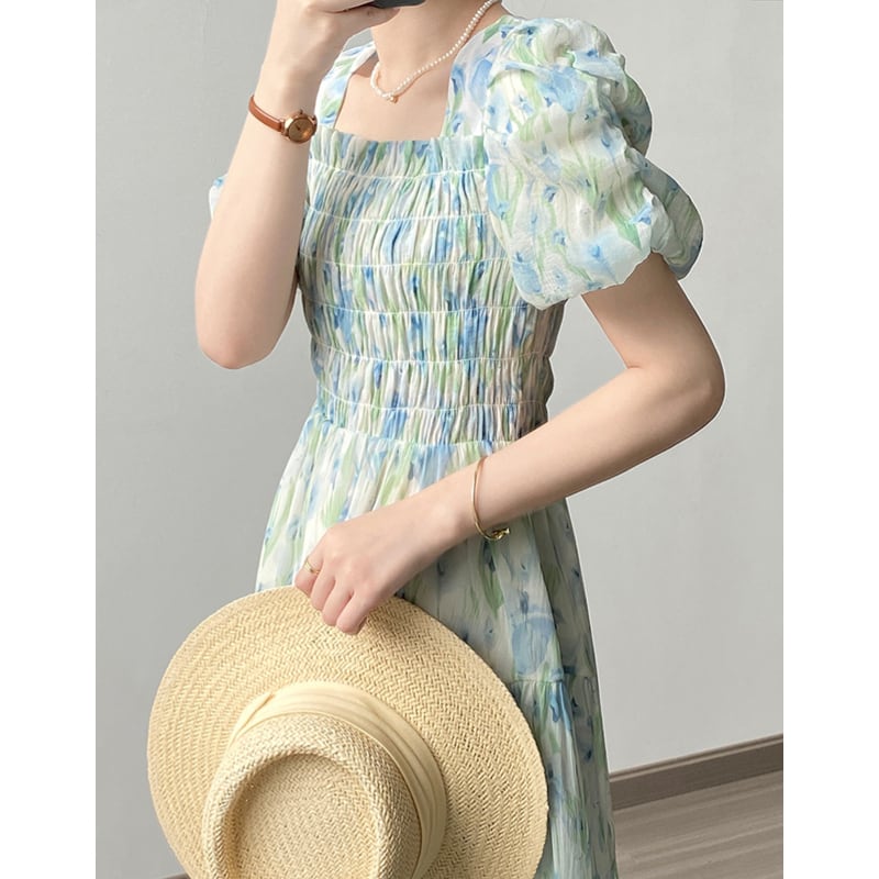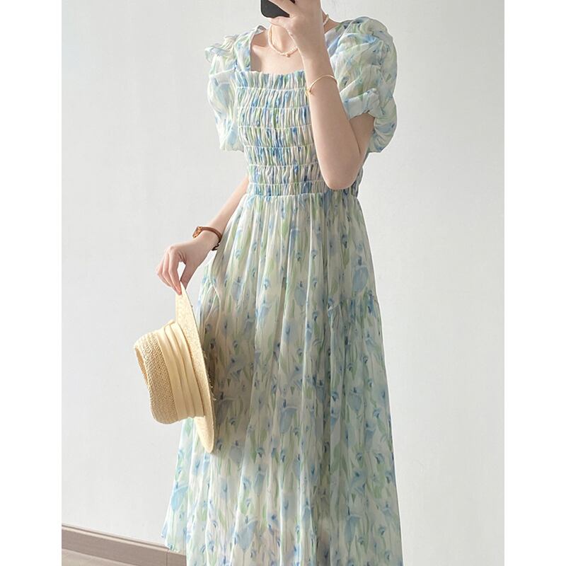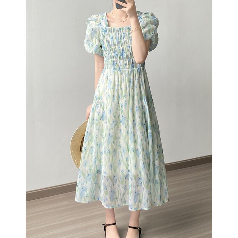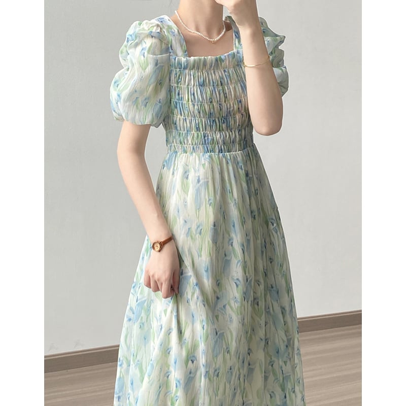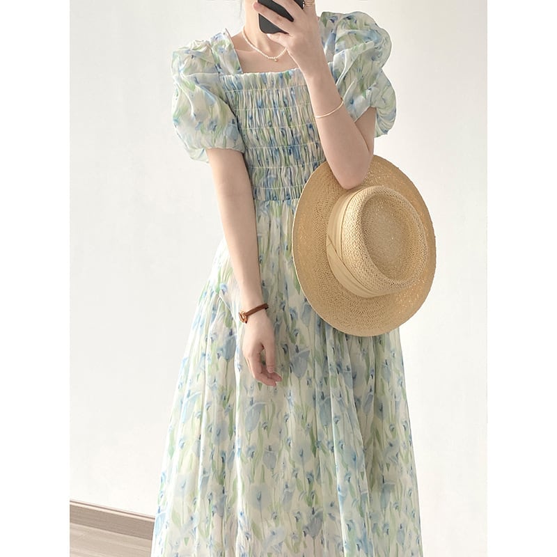 ロングワンピース 花柄 パフスリーブ スクエアネック スウィート ブルー+グリーン M L