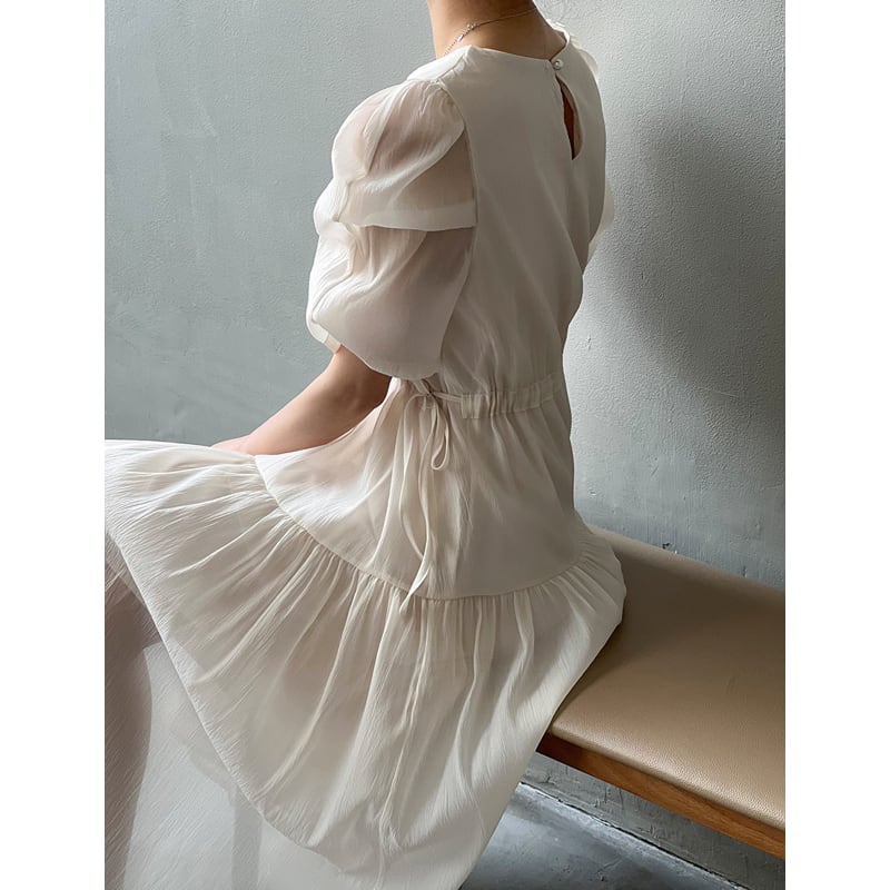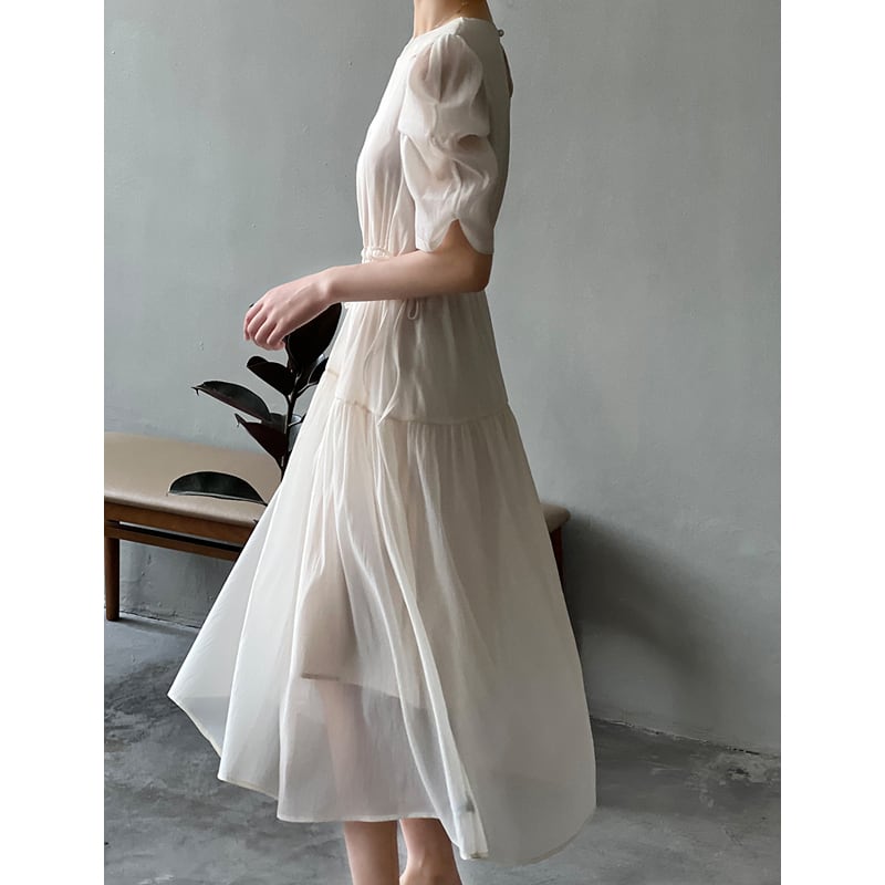ワンピース 2色展開 ラウンドネック パフスリーブ レトロ ベージュ グリーン M L