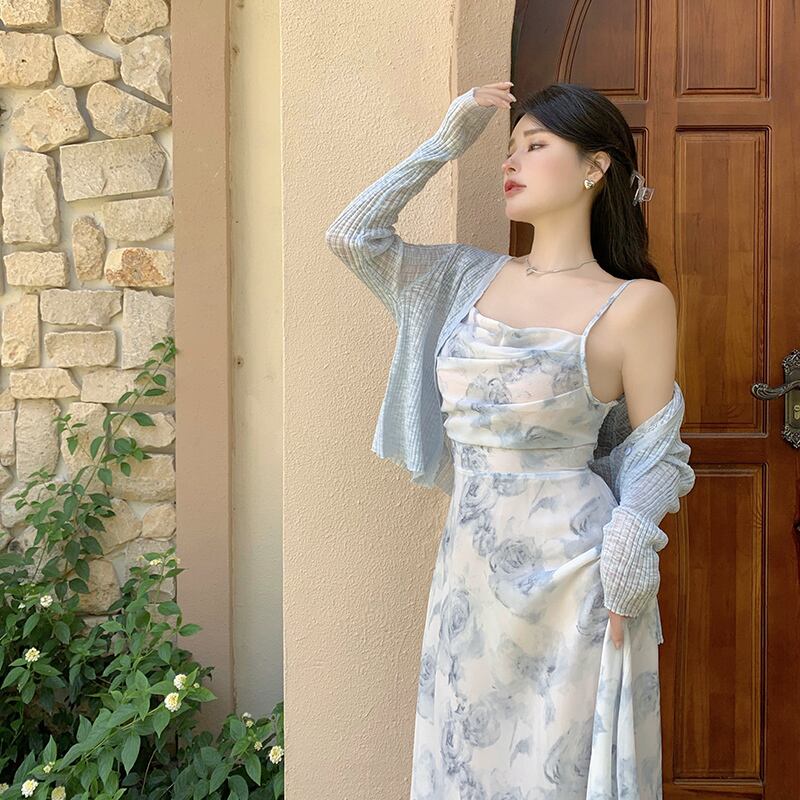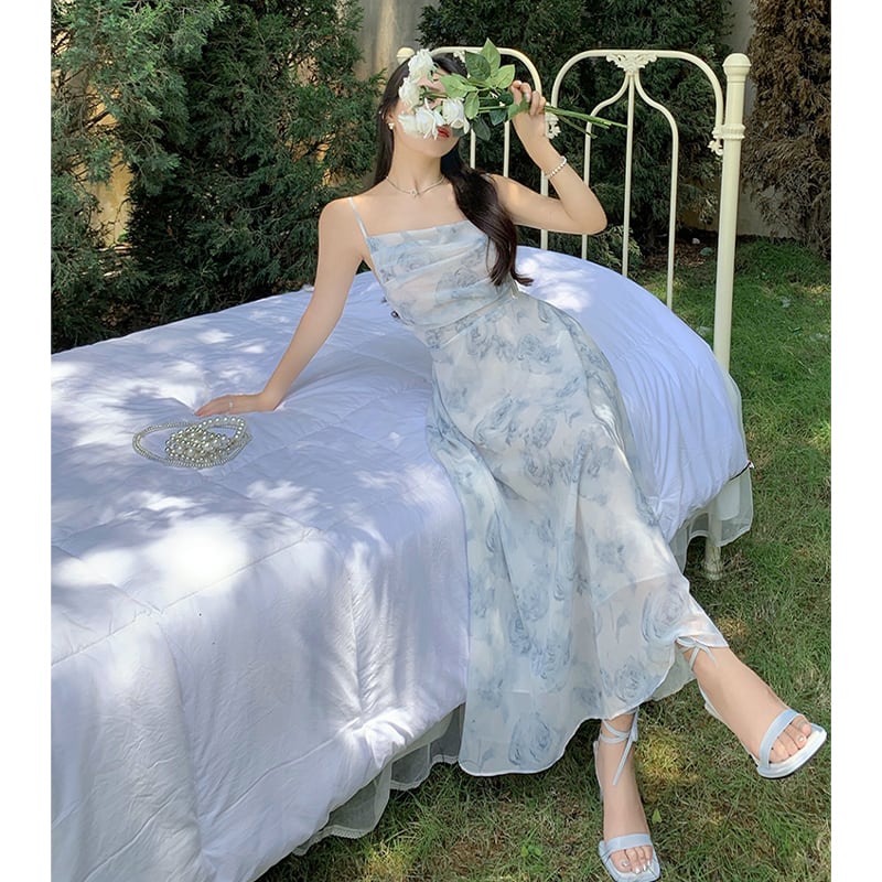 ワンピース 文芸風 清新 花柄 シフォン 吊りワンピース ブルー S M L