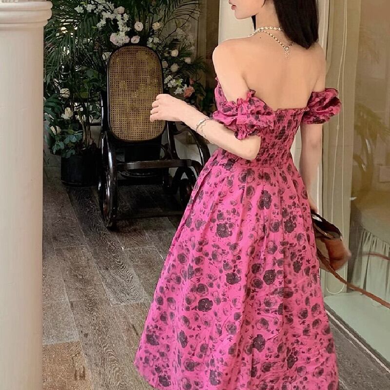 【SummerVacationシリーズ】ワンピース ボートネックデザイン 花柄 パーティー ローズ色 S M L XL