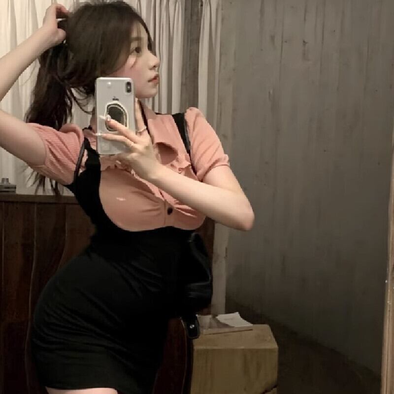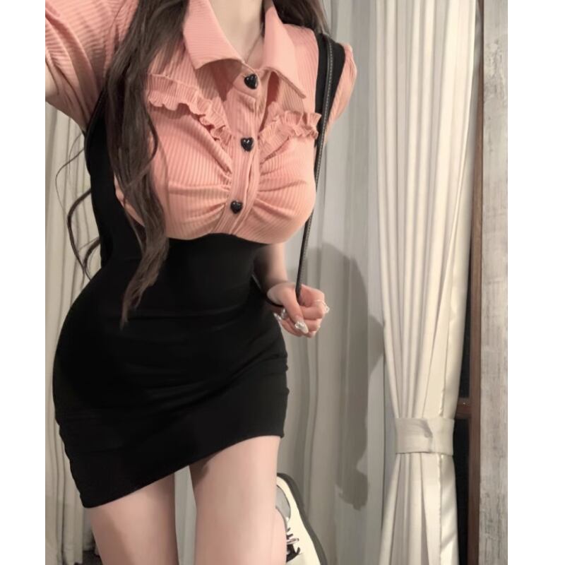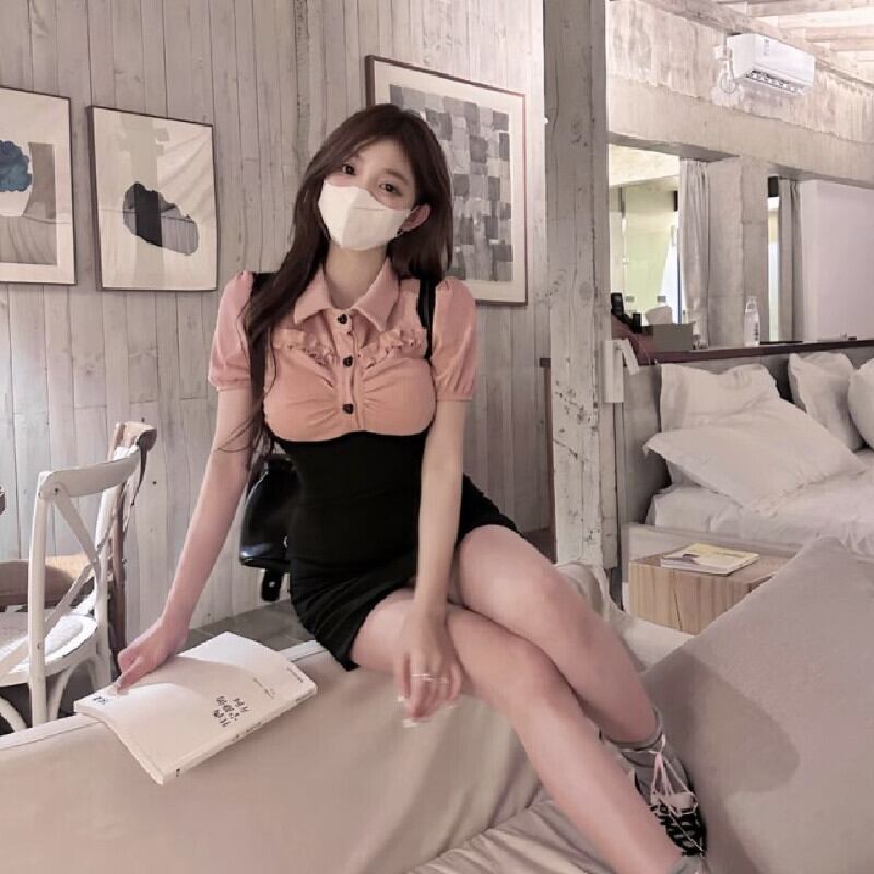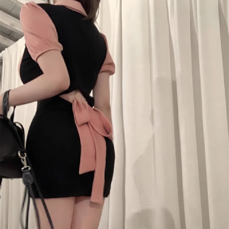 ワンピース 2色展開 POLOネック ミニ丈 バックリボン フェイクレイヤード ピンク ホワイト S M