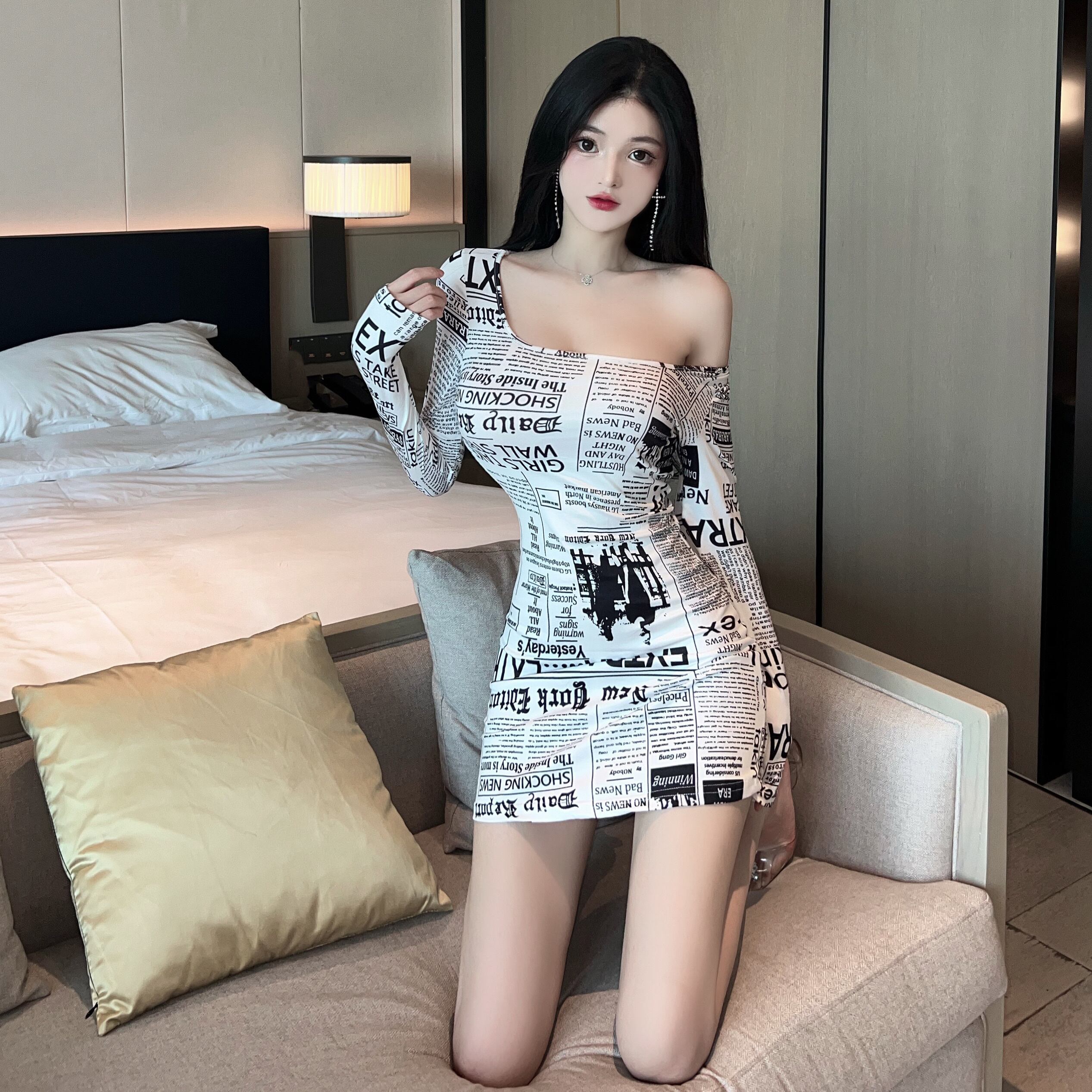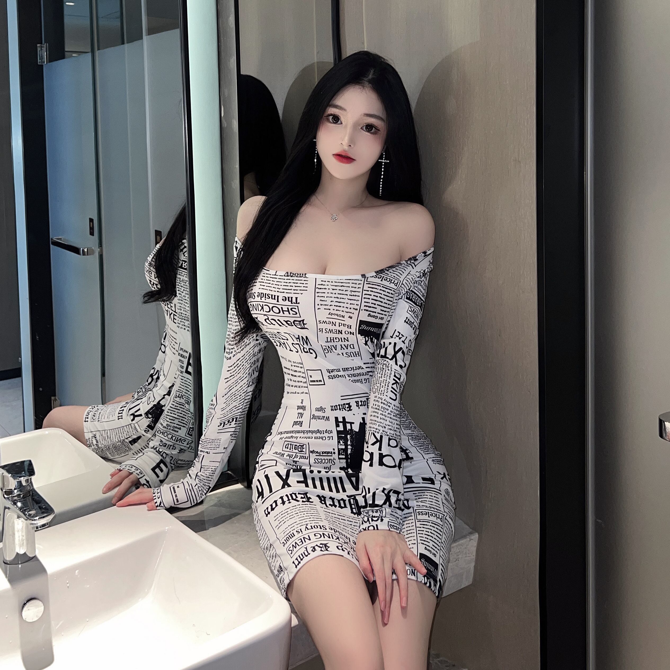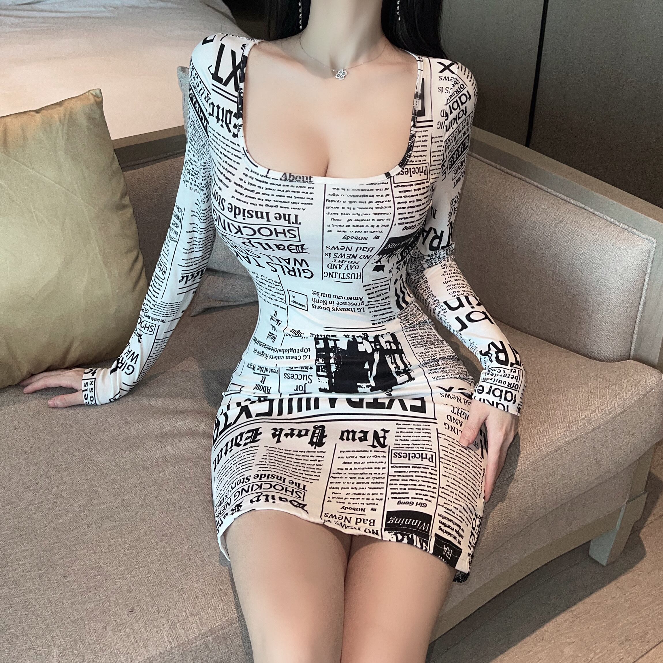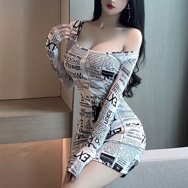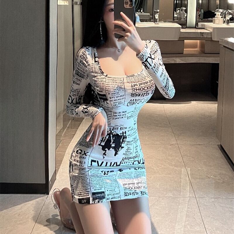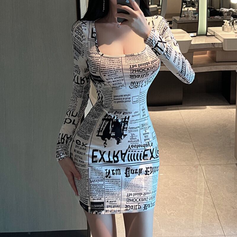ワンピース セクシー 長袖 スクエアネック アルファベット S M L XL