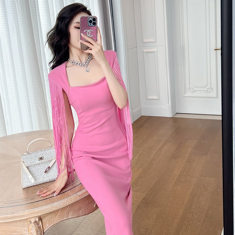 【夕暮薔薇シリーズ】パーティードレス タッセル スクエアネック バックスリット ピンク S M L XL