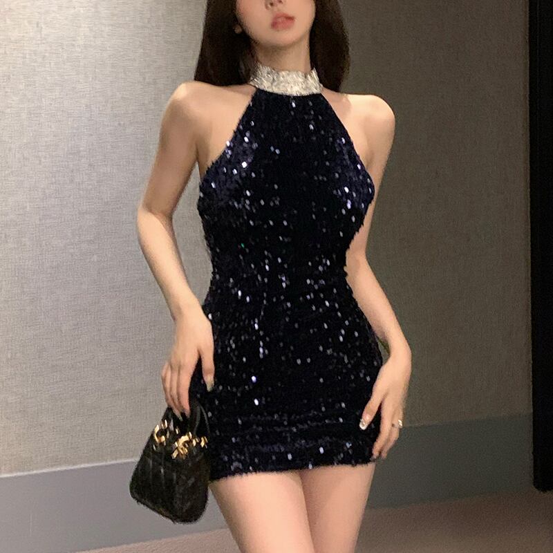 ワンピース おしゃれ セクシー パーティー スパンコール 背見せ ブラック S M