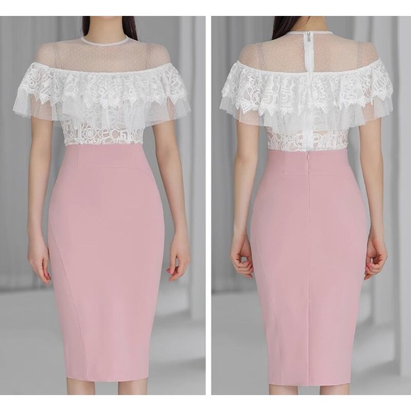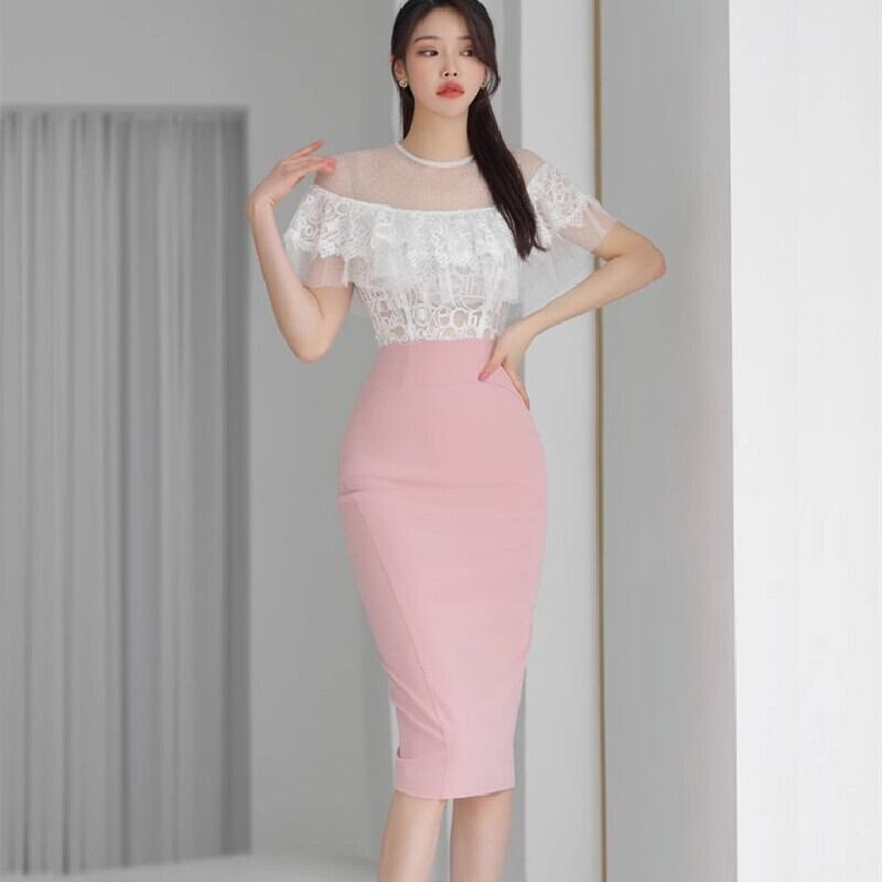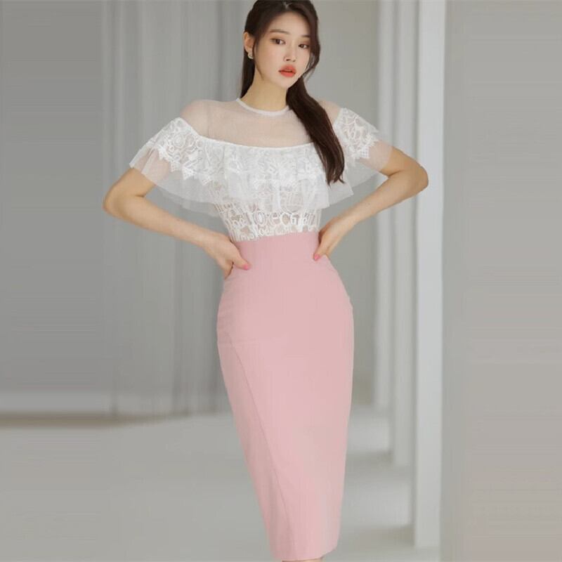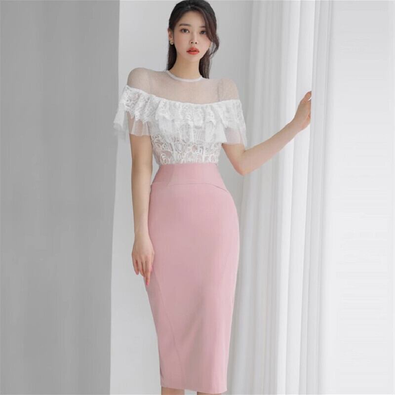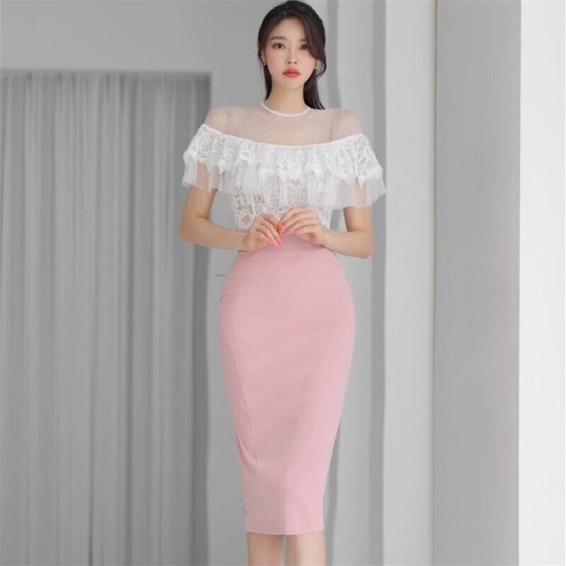 セットアップ トップス+スカート レース ドット柄 ペプラム ホワイト+ピンク S M L XL