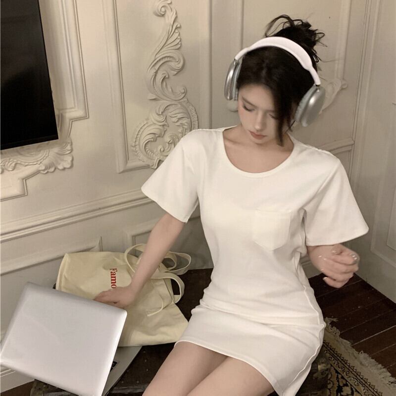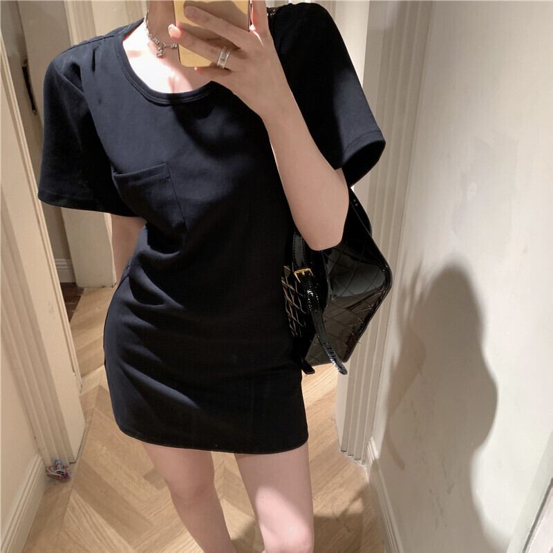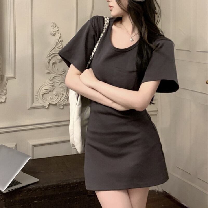 ワンピース カジュアル ラウンドネック 半袖 無地 ミニ丈 ダークグレー ホワイト ブラック