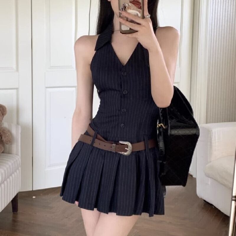 ワンピース ストライプ柄 Aライン シングルブレスト ダークブルー S M L