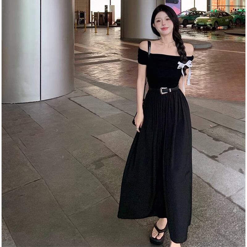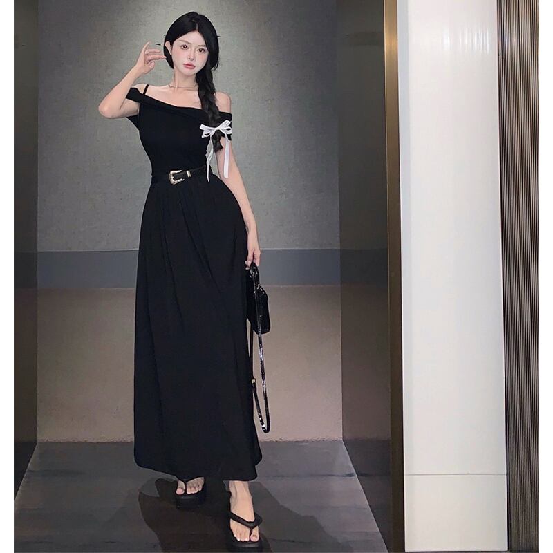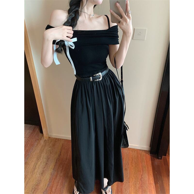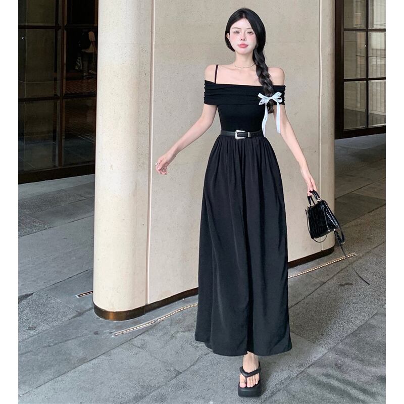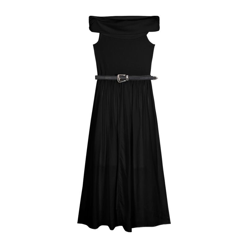 ワンピース ベルト付き ボートネック ロング丈 エレガント 優しい ブラック ホワイト