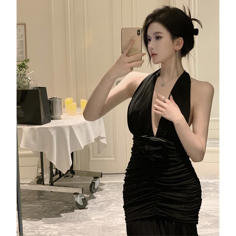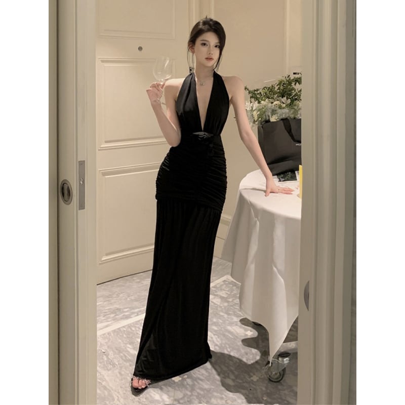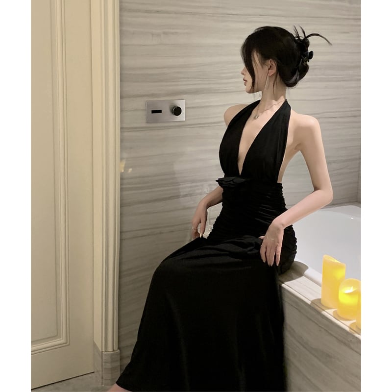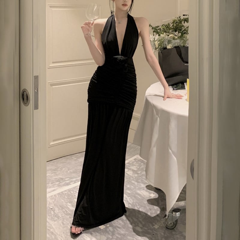 ワンピース 視線集中 セクシー ホルターネック フランス風 パーティー ロング丈 ブラック S M