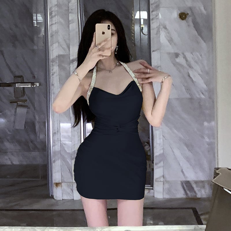 ワンピース セクシー デザイン感 ホルターネック ラインストーン ブラック イエロー S M L