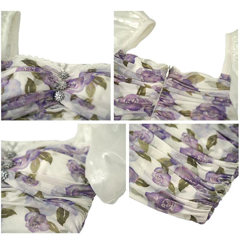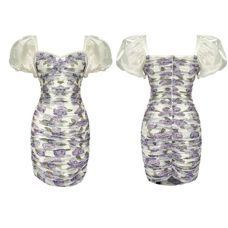 【夕暮薔薇シリーズ】ワンピース セクシー フランス風 スクエアネック 花柄 パープル S M L XL
