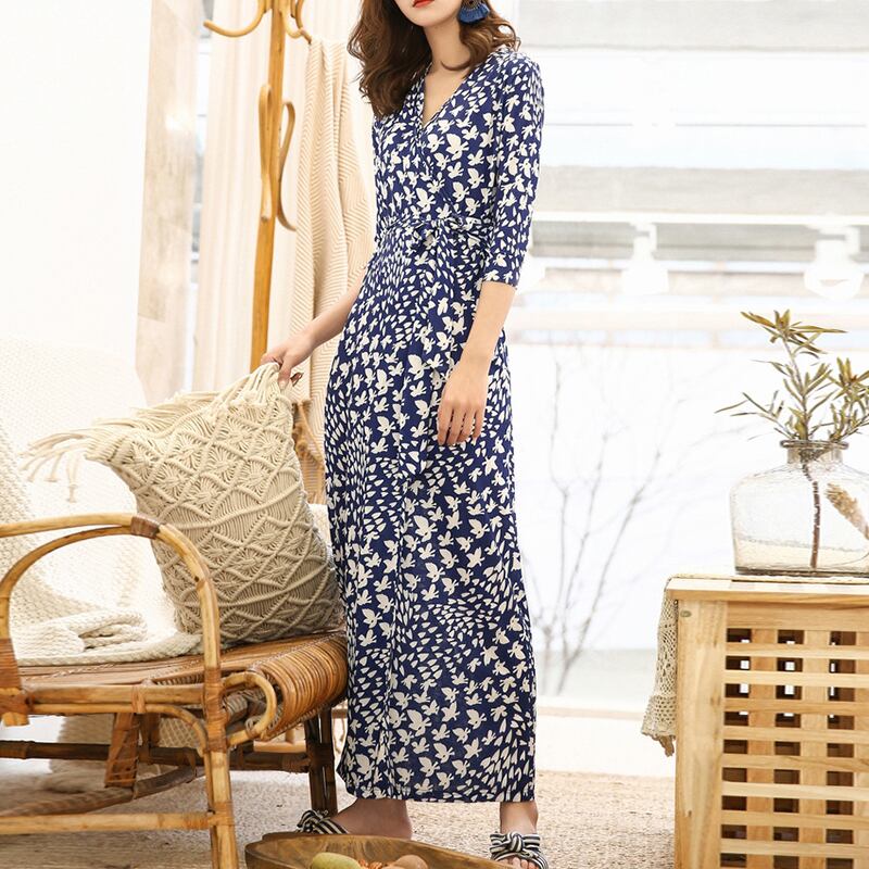 【STRAWBERRY シリーズ】ラップワンピース セクシー レトロ Vネック バタフライ柄 S字型 巻きつける ロング丈 ブルー XS S M L XL