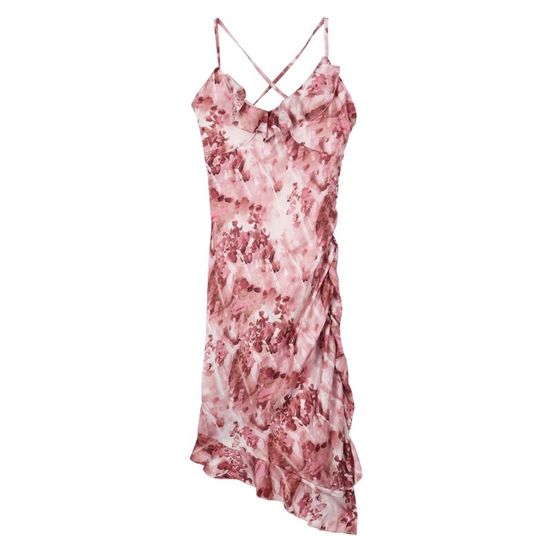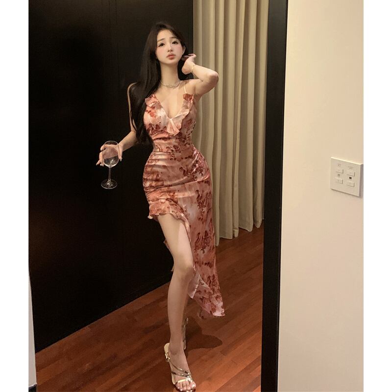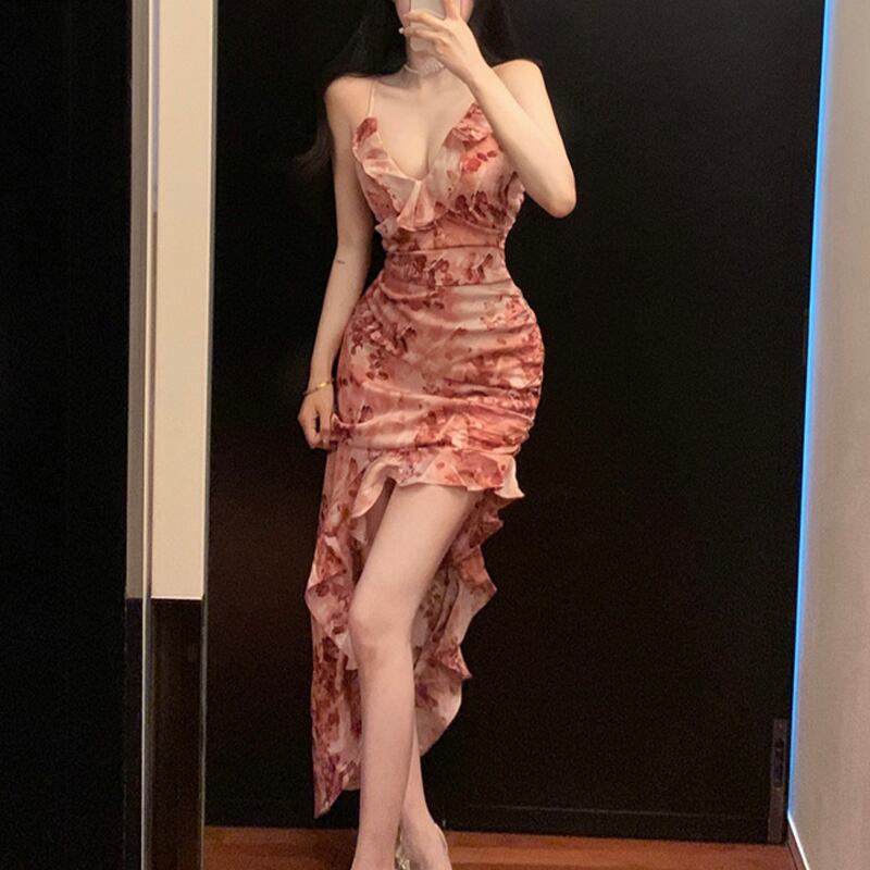 ワンピース セクシー シフォン かわいい パプラム 花柄 吊りワンピース S M