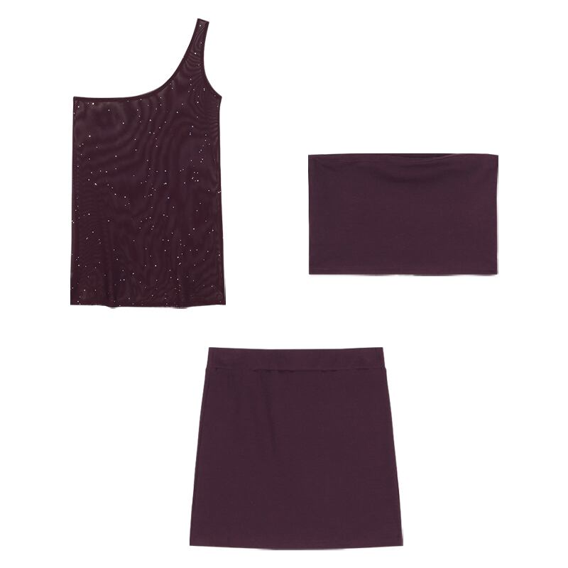 3点セット セットアップ セクシー パーティー チュール素材 ワンショルダー チューブトップ+ワンピース+スカートパープル XS S M L
