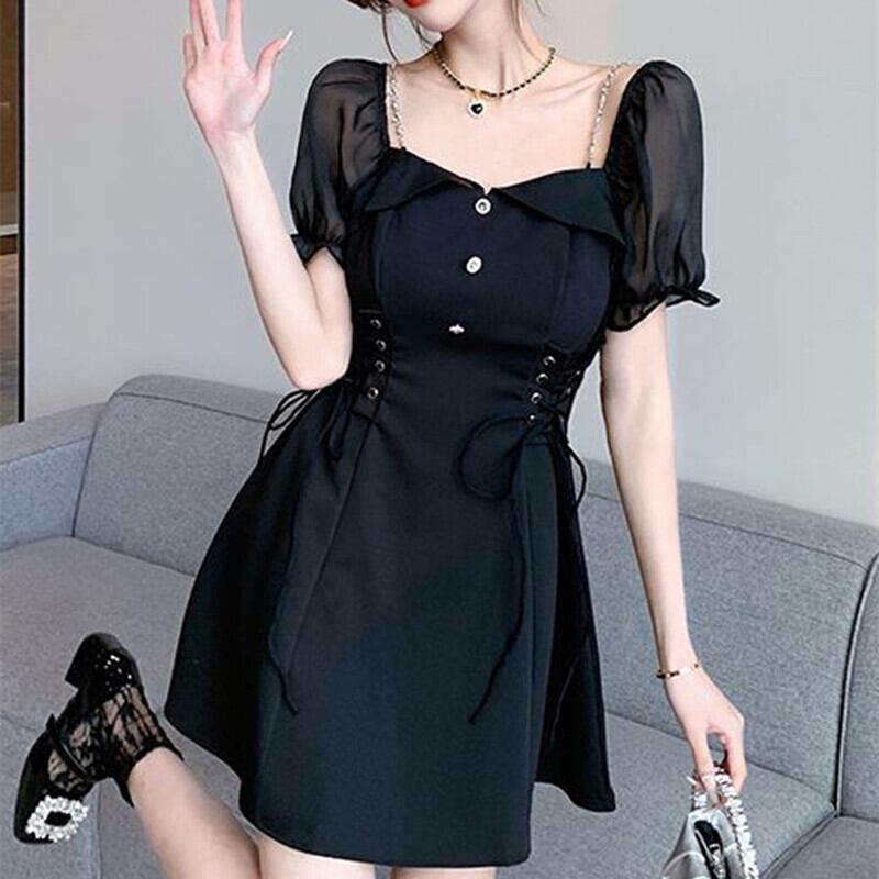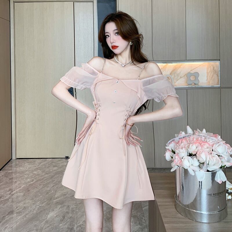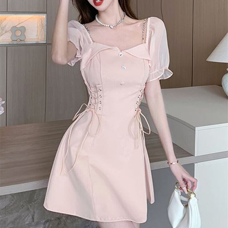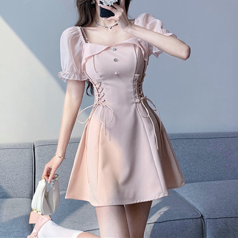 ワンピース 人気新作 半袖 カジュアル Aライン パフスリーブ ピンク ブラック S M L XL