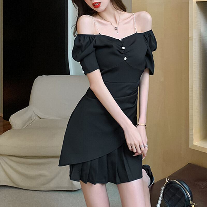 ワンピース プリーツスカート カジュアル パフスリーブ ブラック ホワイト S M L XL