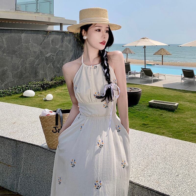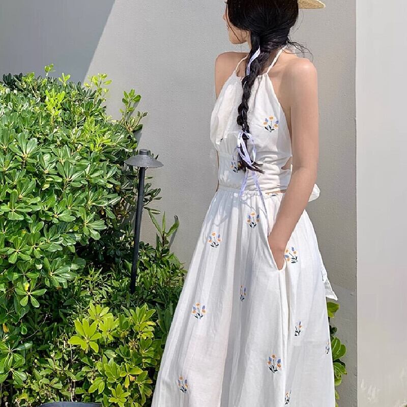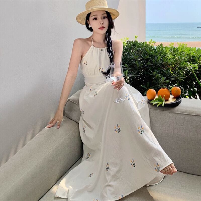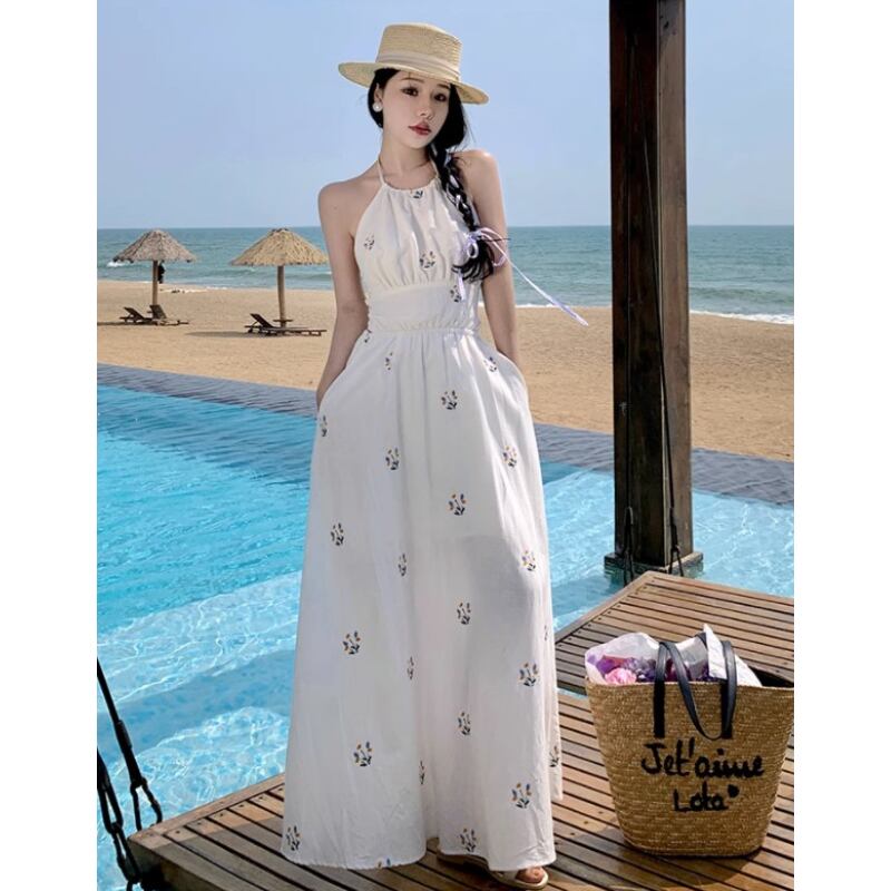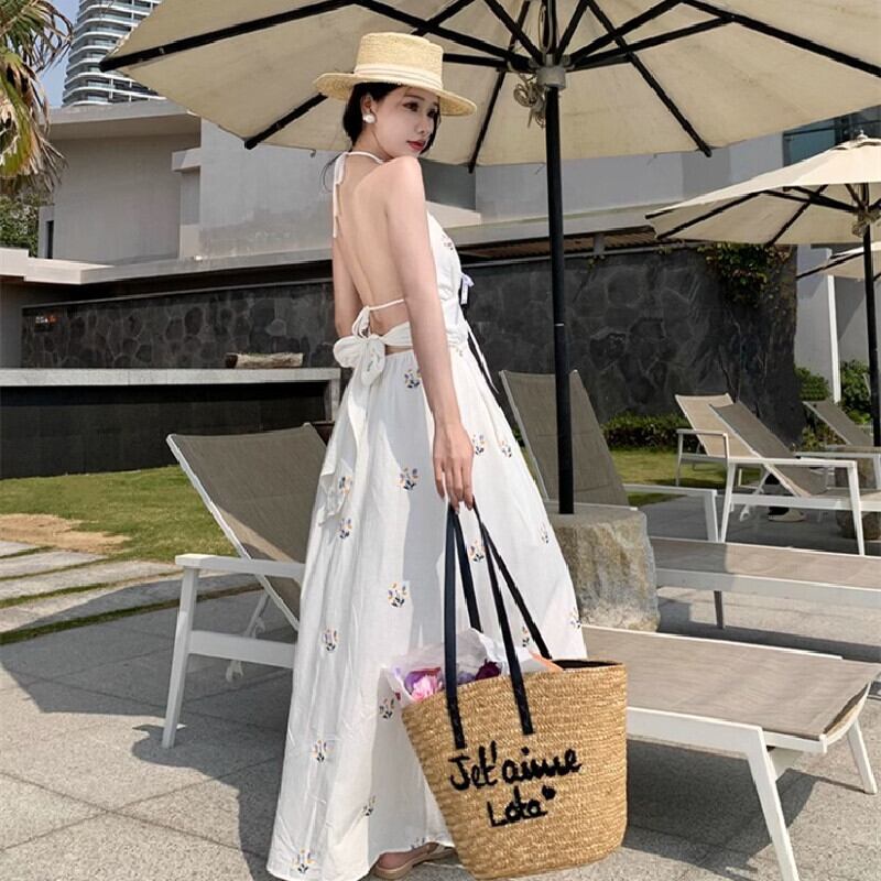 【SummerVacationシリーズ】吊りワンピース 刺繡 バックリボン 大振裾 浜 撮影着 ホワイト S M L