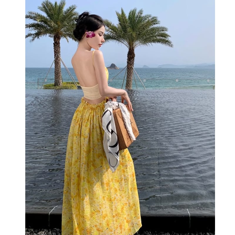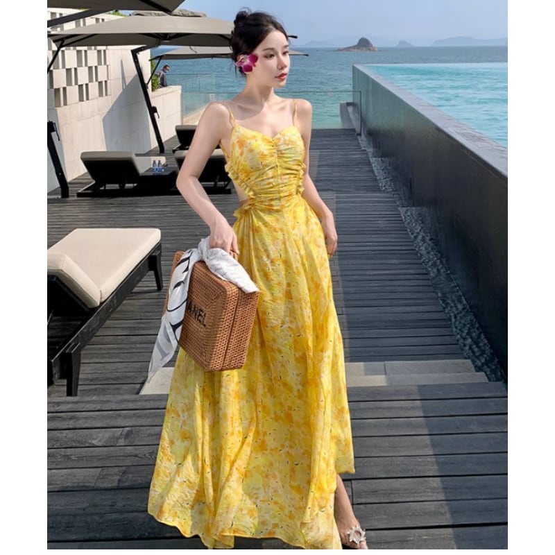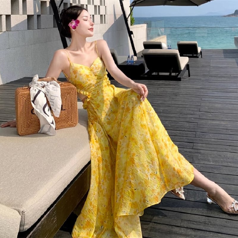 【SummerVacationシリーズ】ロングワンピース 黄色い 花柄 撮影着 イエロー S M L