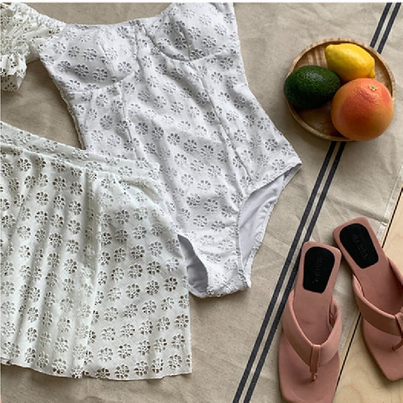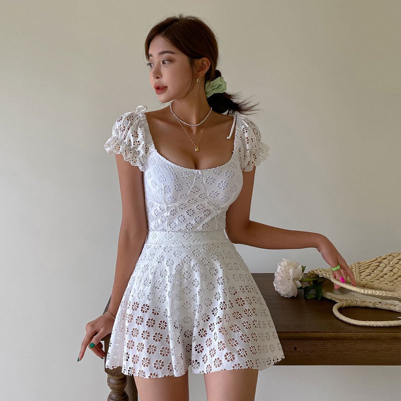 水着 温泉 透かし彫り 白 パフスリーブ スクエアネック ホワイト M L XL