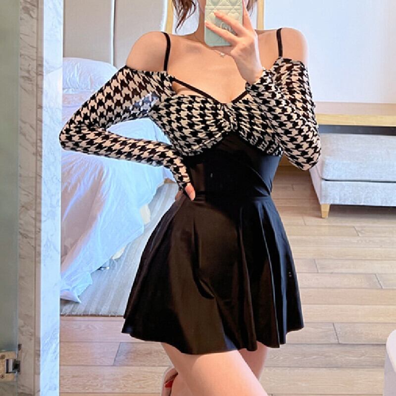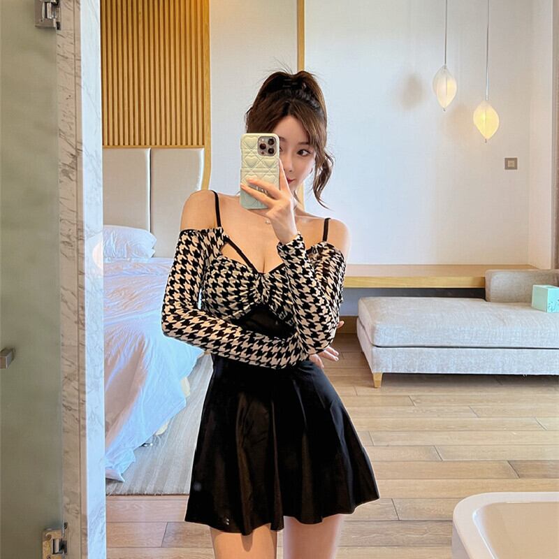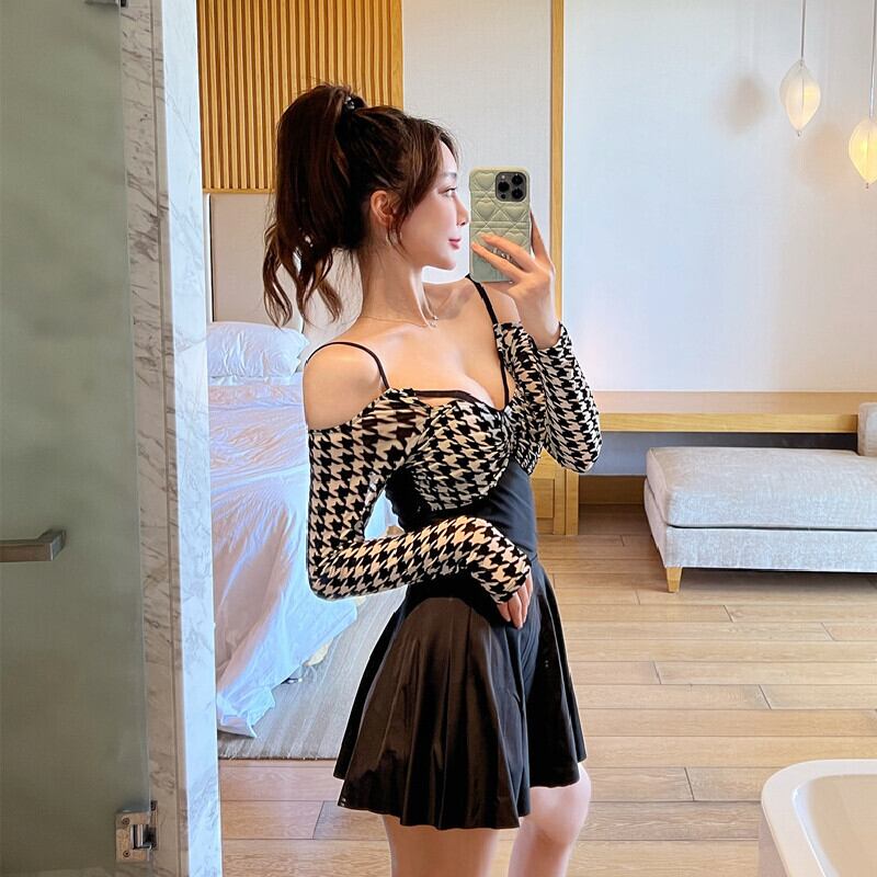 水着 ボートネックデザイン 千鳥格子柄 温泉 Aライン ブラック M L XL