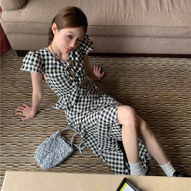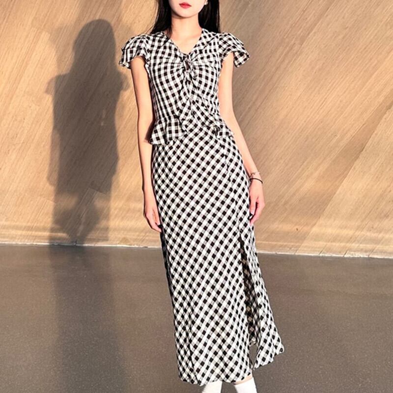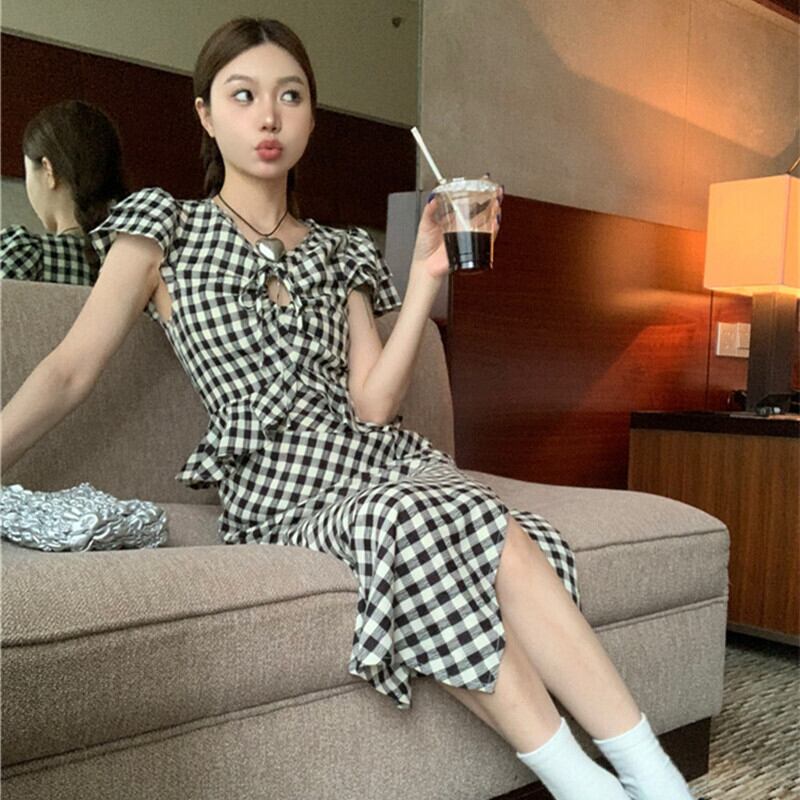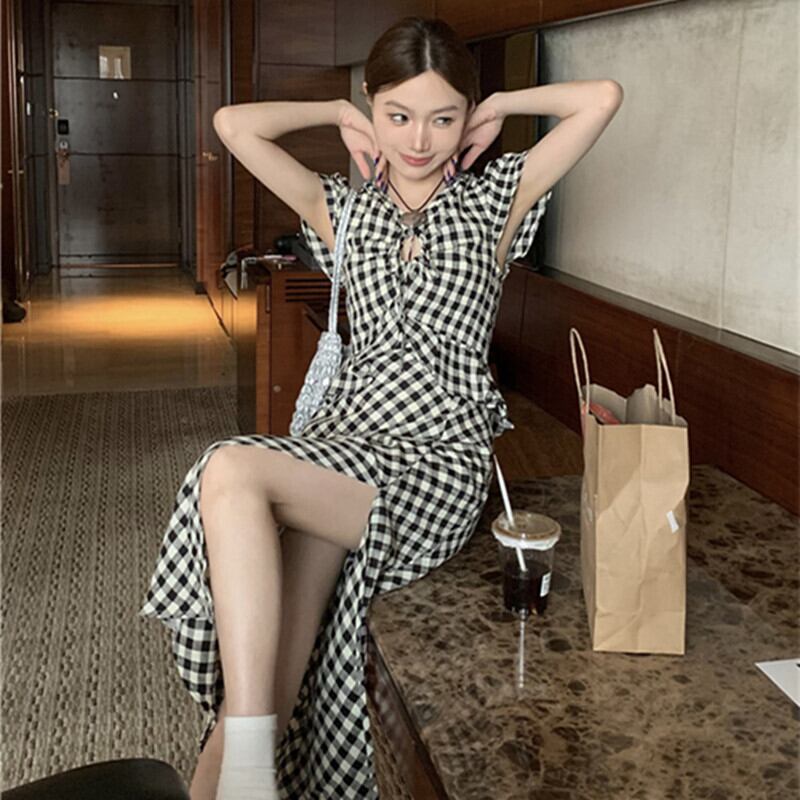ワンピース カジュアル Vネック 透かし彫り チェック柄 スリット S M