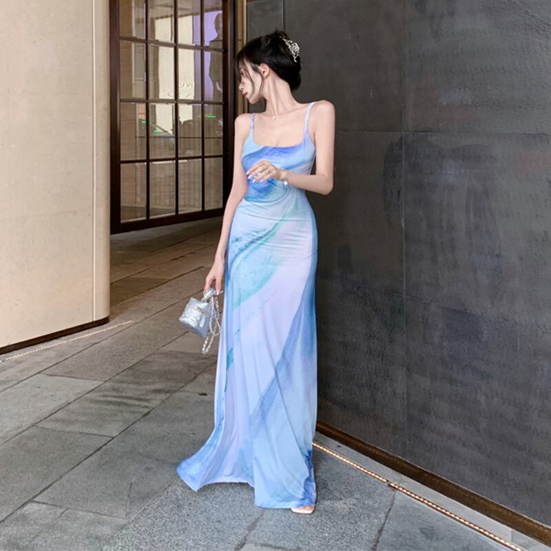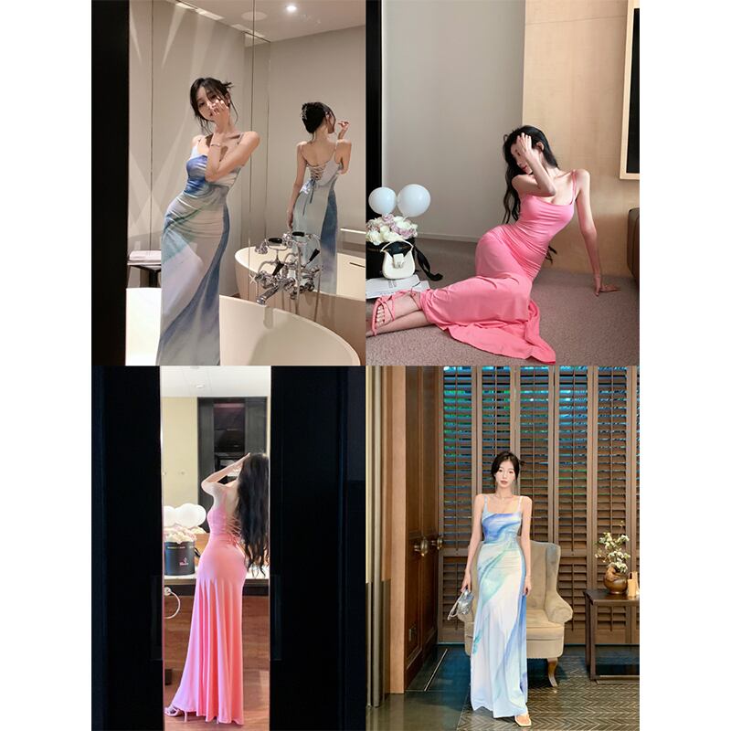 ワンピース エレガント デザイン感 不規則カラー 吊りワンピース ブルー ピンク